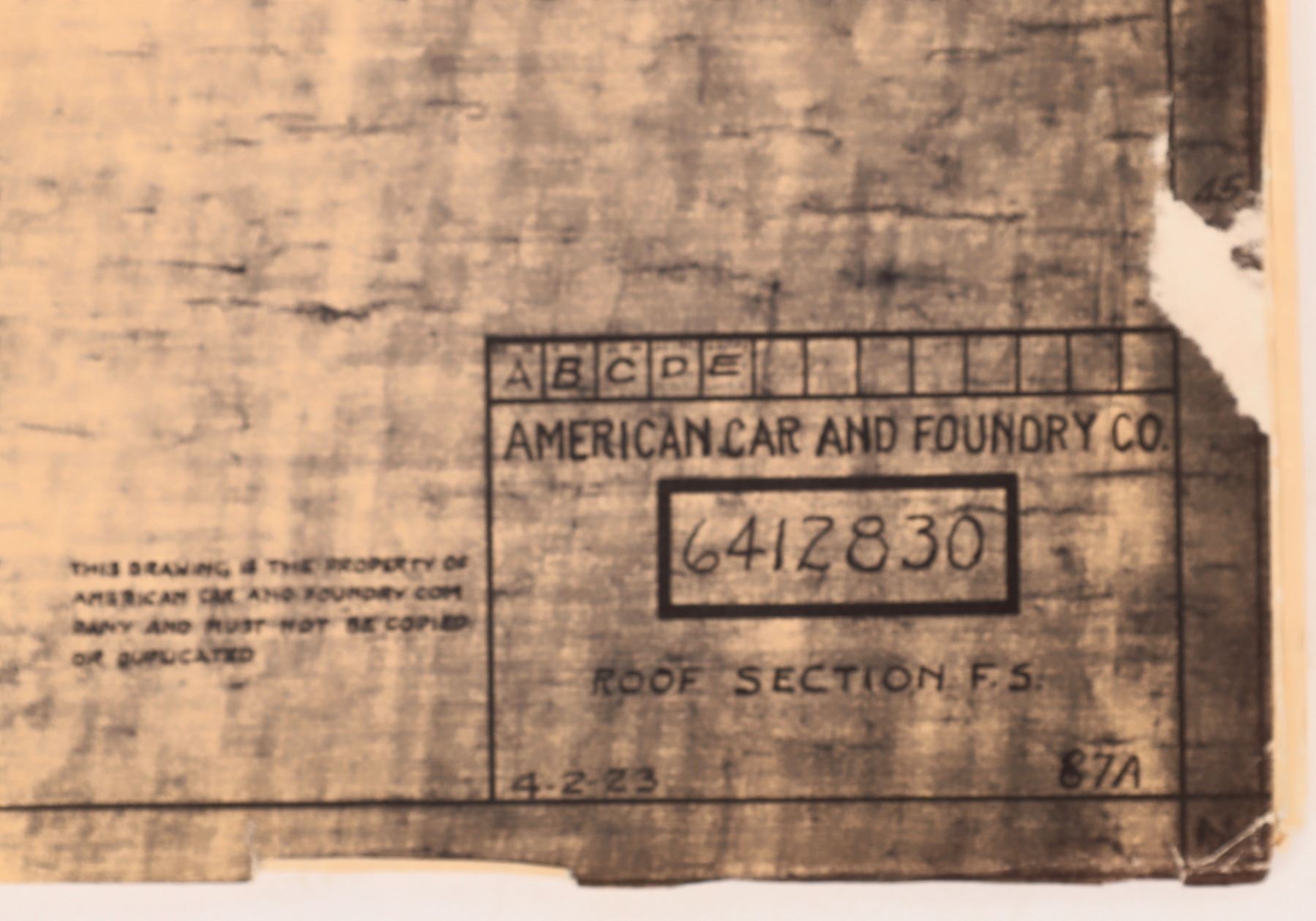 9 large American Car and Foundry railcar blueprints and mechanical drawings as would be used in the factory. Mostly Interstate Sleeper. Roof section, end frame, bottom frame etc. c 1920's.