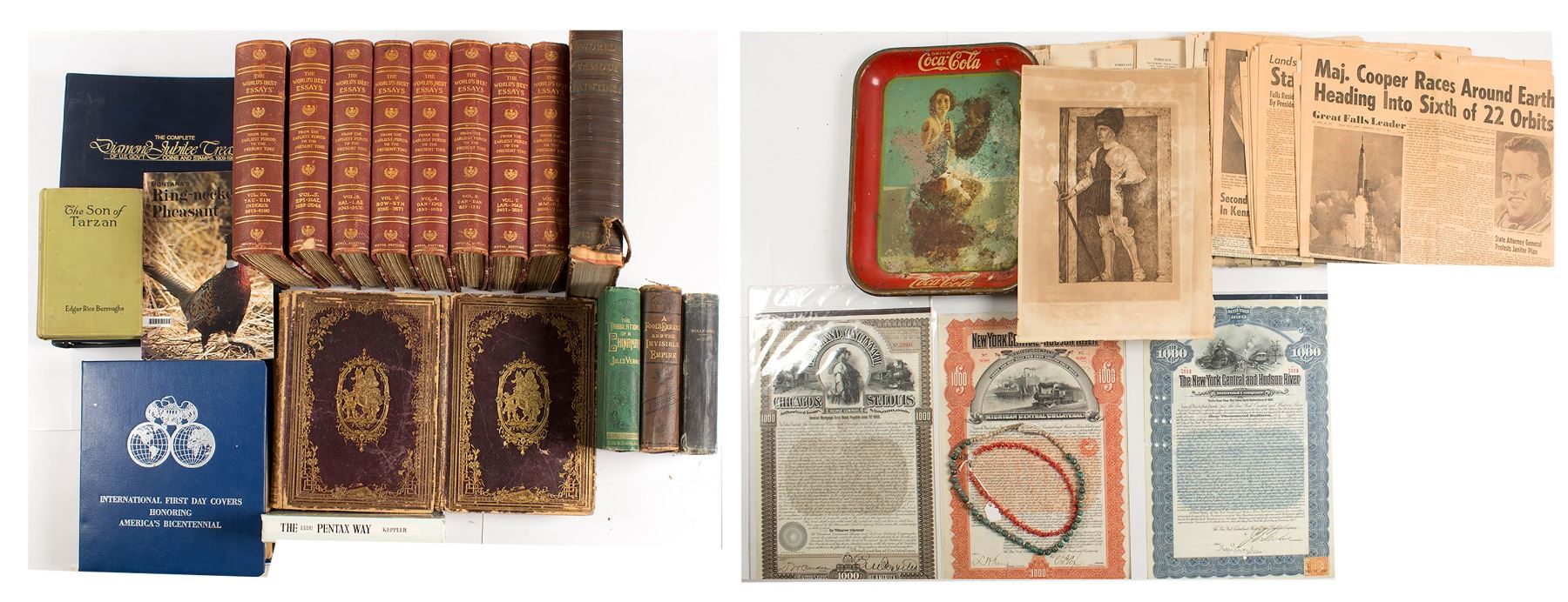 This is a dealer's grab bag with everything from stock certificates, old history books, newspapers from the 1960's, panoramic photo of WWI tank and soldiers, books on photography, cow horns and several other collectible items. Two albums first day covers/stamps; about ten 1960's newspapers of national significance such as Apollo flight, Sirhan Sirhan; three c1910 railroad bonds; original Coke tray (needs restoration); Early engraving (foxed) - soldier c 1700; World Famous Paintings by Kent, 1939; History of All Nations by Goodrich, 1857, loaded with prints; the world's Best Essays, 8 vols of ten, David Brewer, editor, 1910, printed by Kaiser of St. Louis, #350; Son of Tarzan 1917; other books and misc.