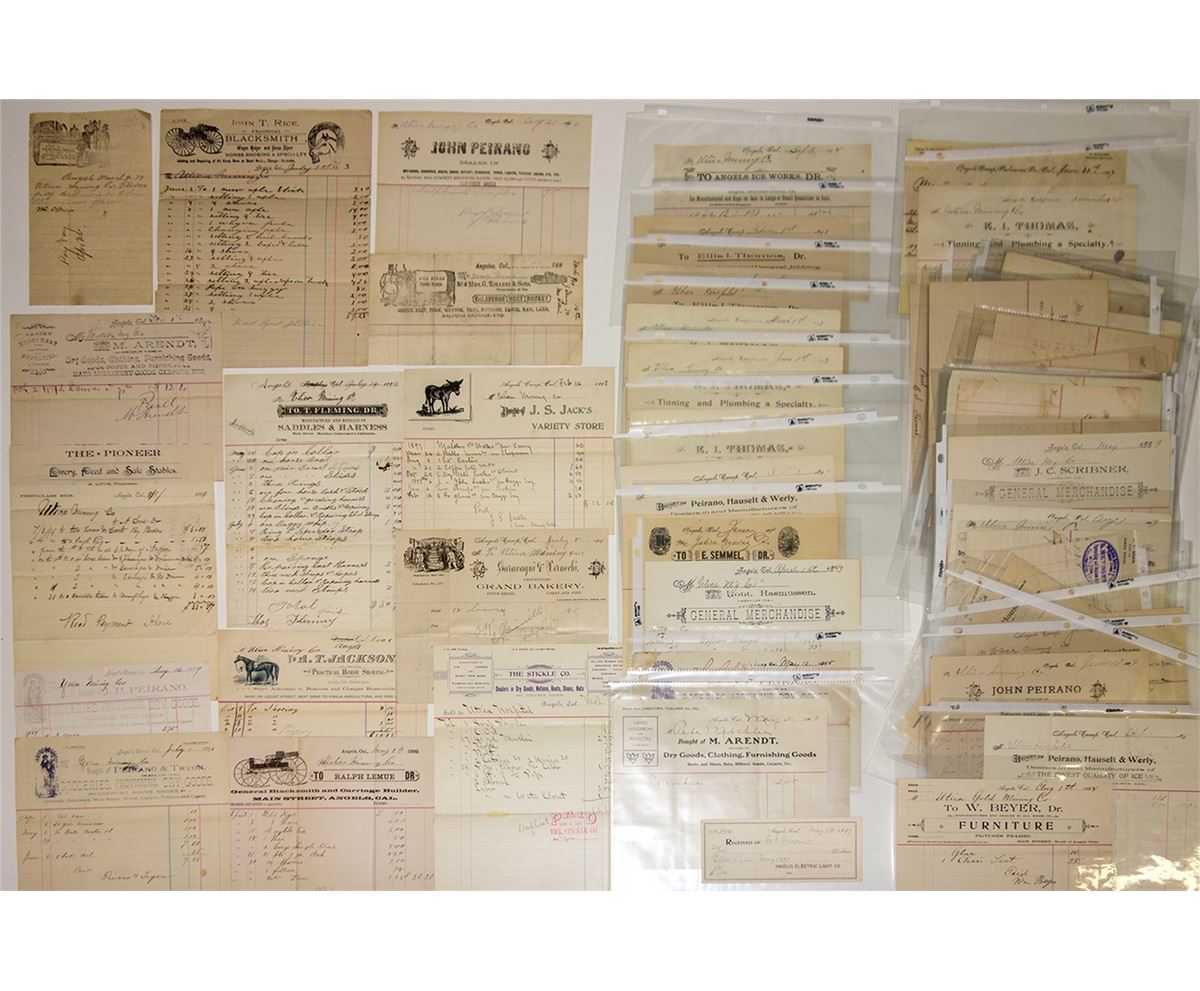 About 40 different billheads including general merchandise, horse & carriage, and services. Names include Ellis Thomas, City Garage, Peachy & McGlory, Beyssen, Adair, John Peirano, JC Scribner, Stickel, E Semmel, Robert Rasmussan, M Arendt, Tryon, Hauselt, Werly, Lagormarsino, The White House, The Pioneer, Frederick Bruner, T Fleming, John Rice blacksmith, Angels Livery Stable, Union Livery Stable, Angels Milling Co., Ralph Lemure, AT Jackson. Rolleri & Sons, Warren Rose, Angels Ice, W Beyer, Grand Bakery, JS Jacks, and Angels Electric Ice. Some Pictorials. Almost 50 pieces!