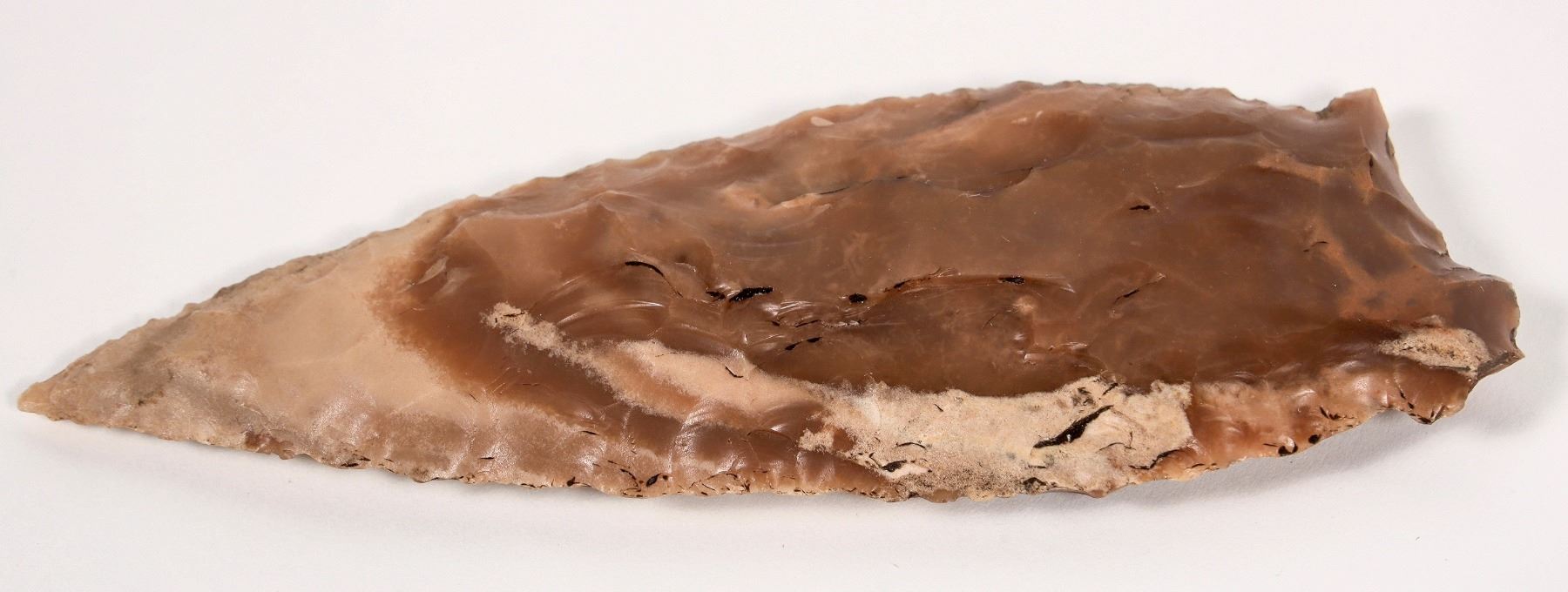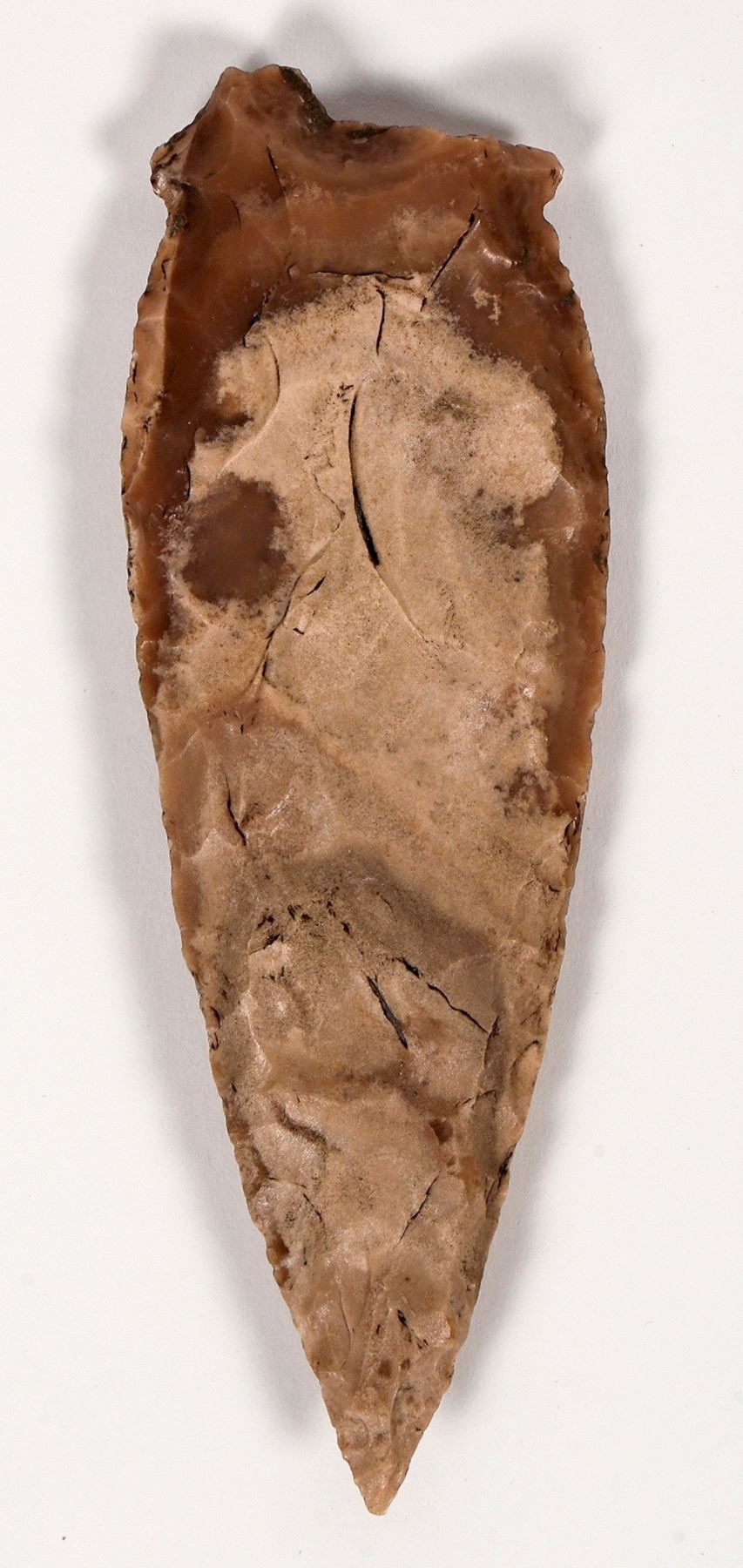 This lanceolate knife is a multi-colored chert at 5.75 in. X 1.875 in. (146mm X 48 mm). It is from the North Texas plains of Woodland County, Texas. An Archaic period piece. From the Donn Conners collection. Please see photo for details.
