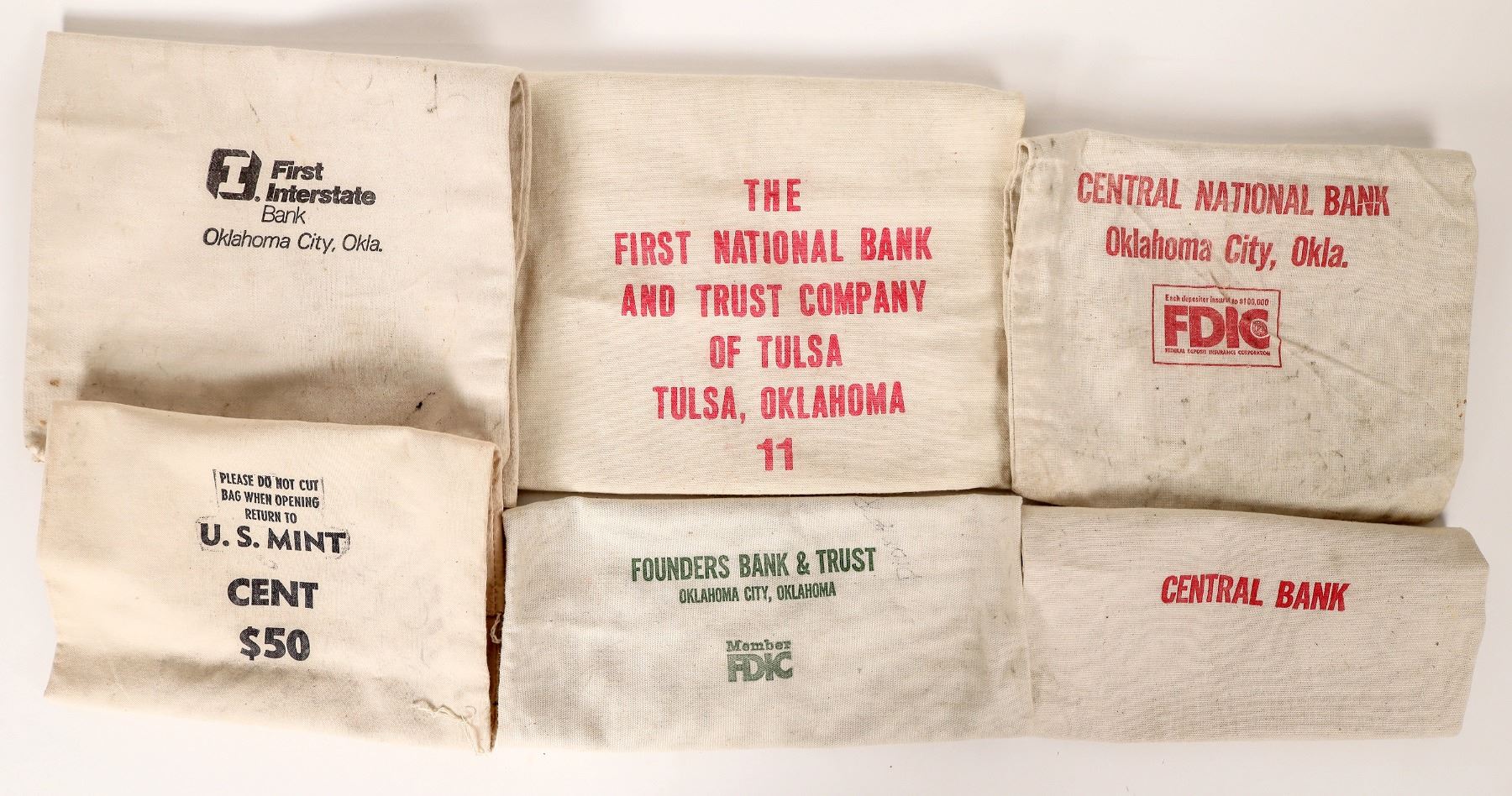6 large cloth coin bags, about 20x11". First Interstate Bank, OKC. US Mint, Cent, $50. Central National Bank, OKC. Central Bank. First National Bank, Tulsa. Founders Bank & Trust, OKC. Gary Bracken Collection
