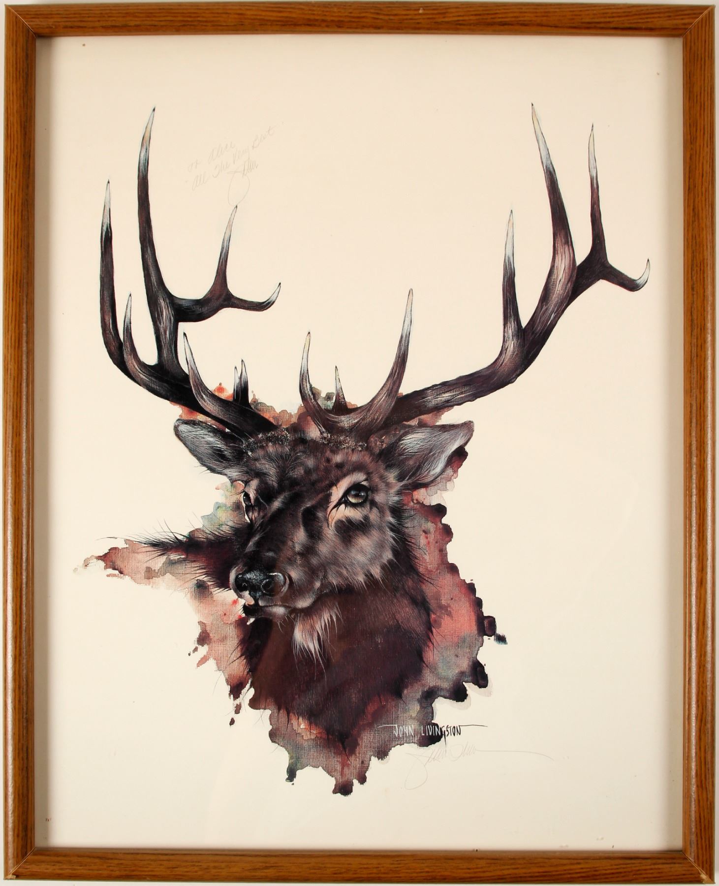 Print by John Livingston of a large buck. The print reads "To Alice, all the very best" signed John. Framed 17" x 21.5".Slight condition of wear at right & left bottom corners. Please inspect.