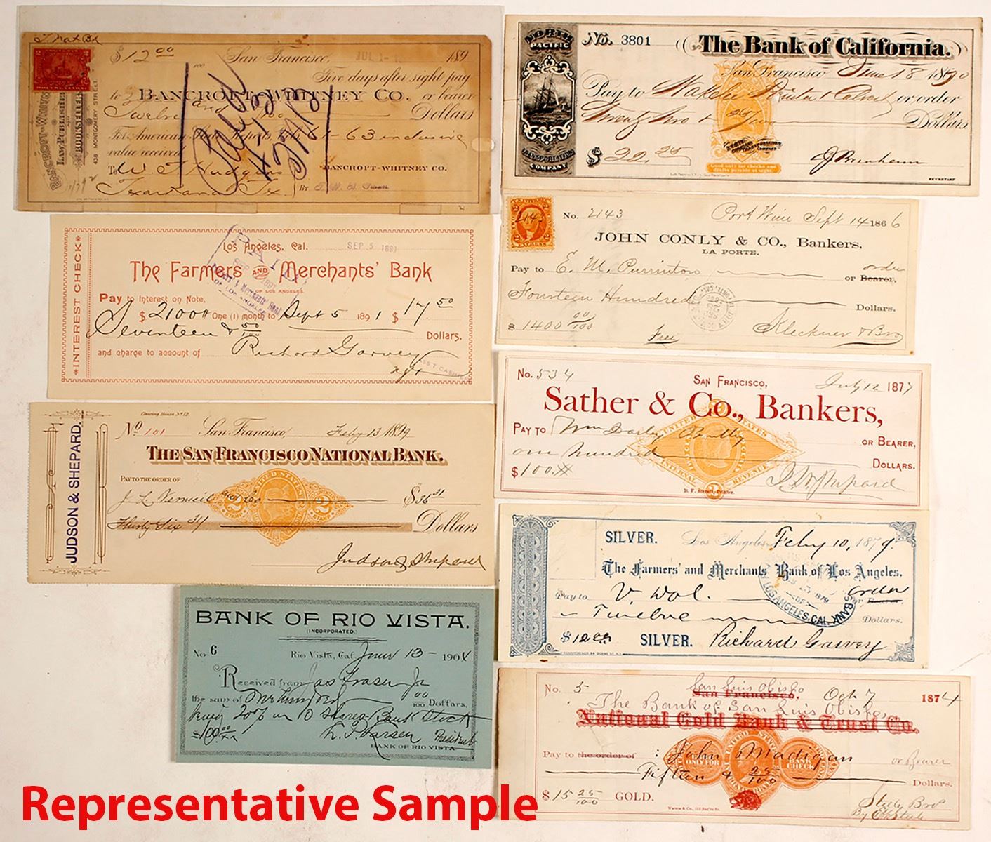 From Los Angeles to San Francisco to Gold Country! Includes Bancroft & Whitney San Francisco check, London & San Francisco Bank of Jacinto, Sather of San Francisco with RN, Farmers and Merchants of Los Angeles, San Francisco National Bank, Bank of California with RN, Security Savings Los Angeles, First National Bank of Pasadena, Bank of Central California at Fresno (four color varieties), Bank of San Luis Obispo with RN, John Conley or Port Wine, Commercial Savings Bank of San Jose, Bank of Rio Vista. Many of these have multiple checks. 1867-1901. Eighty-four total! HWAC# 60948 Date: Location: California