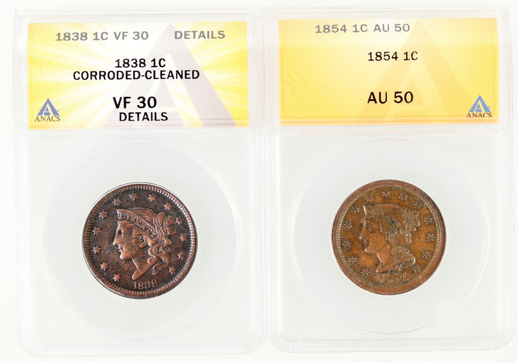 Two ANACS graded large cents: 1) 1838 Coronet Head VF 30 details, corroded-cleaned, attractive looking coin. 2) 1854 Braided Hair cent, AU 50.