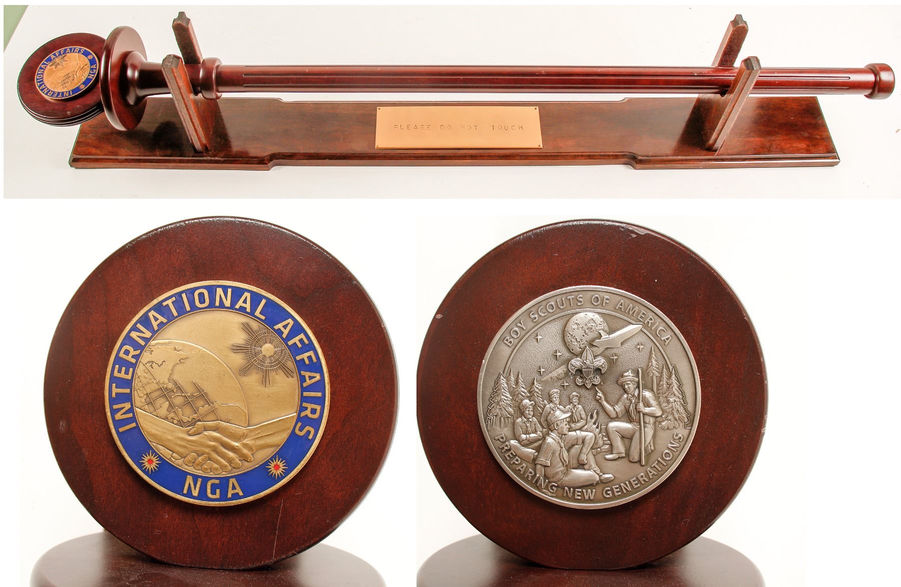 This is a production sample of a full-size ceremonial mace and display cradle made by Medallic Art Company prior to 2016. This mace is made from a walnut shaft approximately 1.25 inches in diameter with a total length of approximately 42 inches including a five-inch-diameter disk mounted vertically at the top. Each face of the walnut disk has a 3-inch-diameter, die-struck medallion, one in antiqued bronze representing the National Geospatial-Intelligence Agency and the other in antiqued cupronickel featuring the Boy Scouts of America. The mace comes with a wooden display cradle, approximately 4x40 inches in size, that holds the mace in two felt-lined forks. There is a 2.5x8.5-inch brass plaque on the cradle that reads, "Please do not touch."