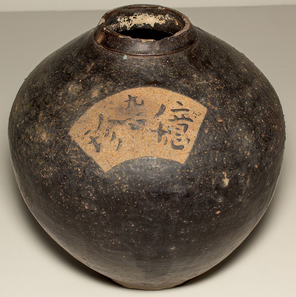 13 1/2" tall and 40" in diameter. Chinese writing on one side! Chips on lid. Excellent and rare example. Ovoid form with some chips around mouth and glaze flaws to be expected with this old of a primitive piece. No cracks or hairlines in the body of this piece.City: Angel's CampCounty: CalaverasState: CADate:
