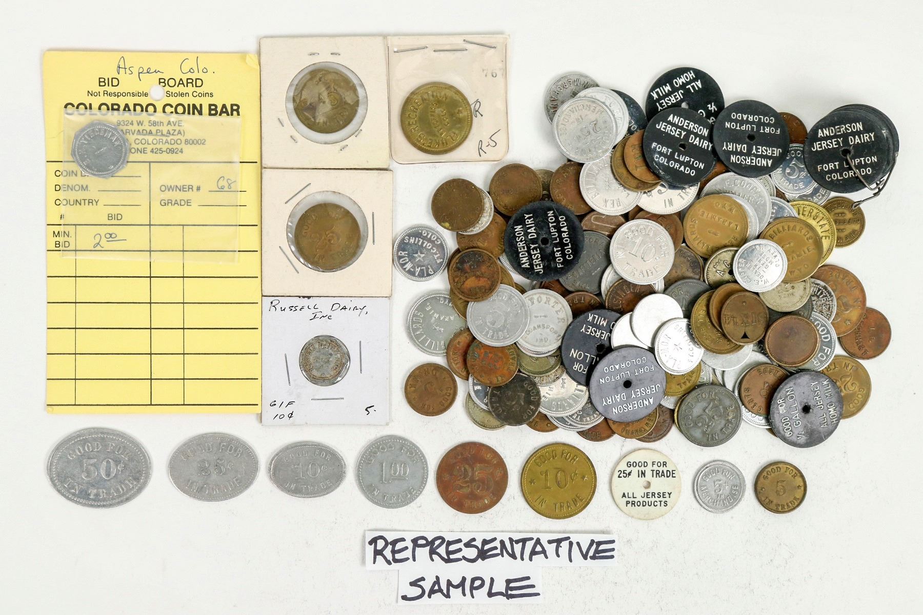 Over 80. Unsorted trade tokens. All in good cond. Colorado, Wyoming, Montana.