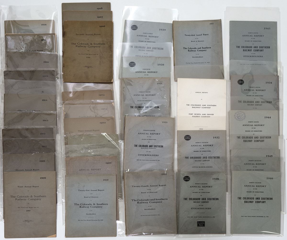 Lot of thirty-four with no duplicates. Includes Numbers 1-16, 18-22, 23-26, 34, 36, 38, 40-41, 45-48, and 1953. It would take a lifetime collecting these individually to get this many! See how the operation of the railroad is going through the eyes of the railroad! What can you expect? well, volume one is 30 pages with a three page fold-out map in the back. Includes other maps, list of materials, improvements, list of engines and rolling stock, traffic statistics, etc. Volume 10 is 31 pages. It has a nine panel fold-out map in pristine condition, Again, lists locomotives by number, number of rolling stock, tonnage, traffic statistics, operating expenses, etc. Volume 23 is 89 pages with a nine panel fold-out map in excellent condition. Has water staining on the top of the pages, most prevalent in the back. Condition varies, but is mostly very good!