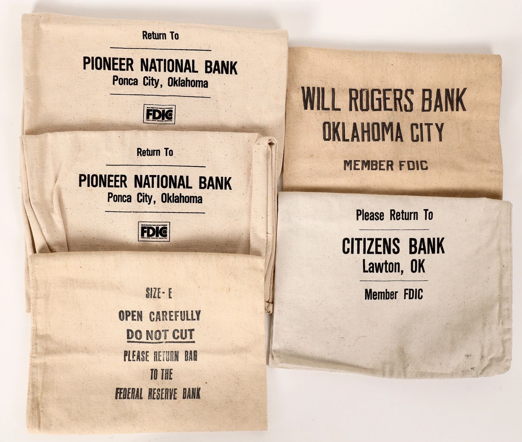5 cloth large currency bags, about 18x13". 2x Pioneer National Bank, Ponca City, OK. Federal Reserve Bank. Citizens Bank, Lawton, OT. Will Rogers Bank, OKC. Gary Bracken Collection