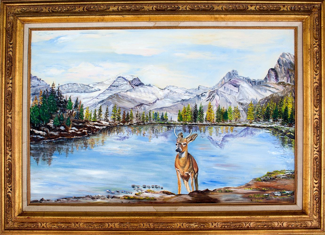 Forty four by thirty two inch gold frame with mountain lake and deer in the foreground. Signed by V Andrade, oil on canvas. State: City: Date: ID# 49563