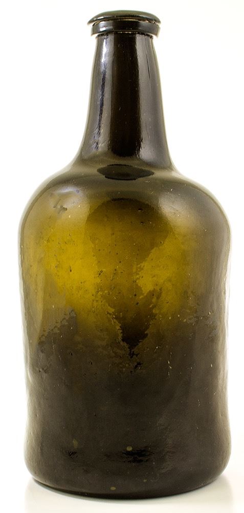 Large early ale bottle. Pontil, 9" tall, 3.75" diameter. These are the heavy dark green to black glass bottles so typically used during the 1700s. this example is a very dark amber. They are often found on the treasure ships off the East Coast. It is difficult to put a collection of these together today. They are a wonderful example of 1700s glass work. City: State: Inventory Number: 38954