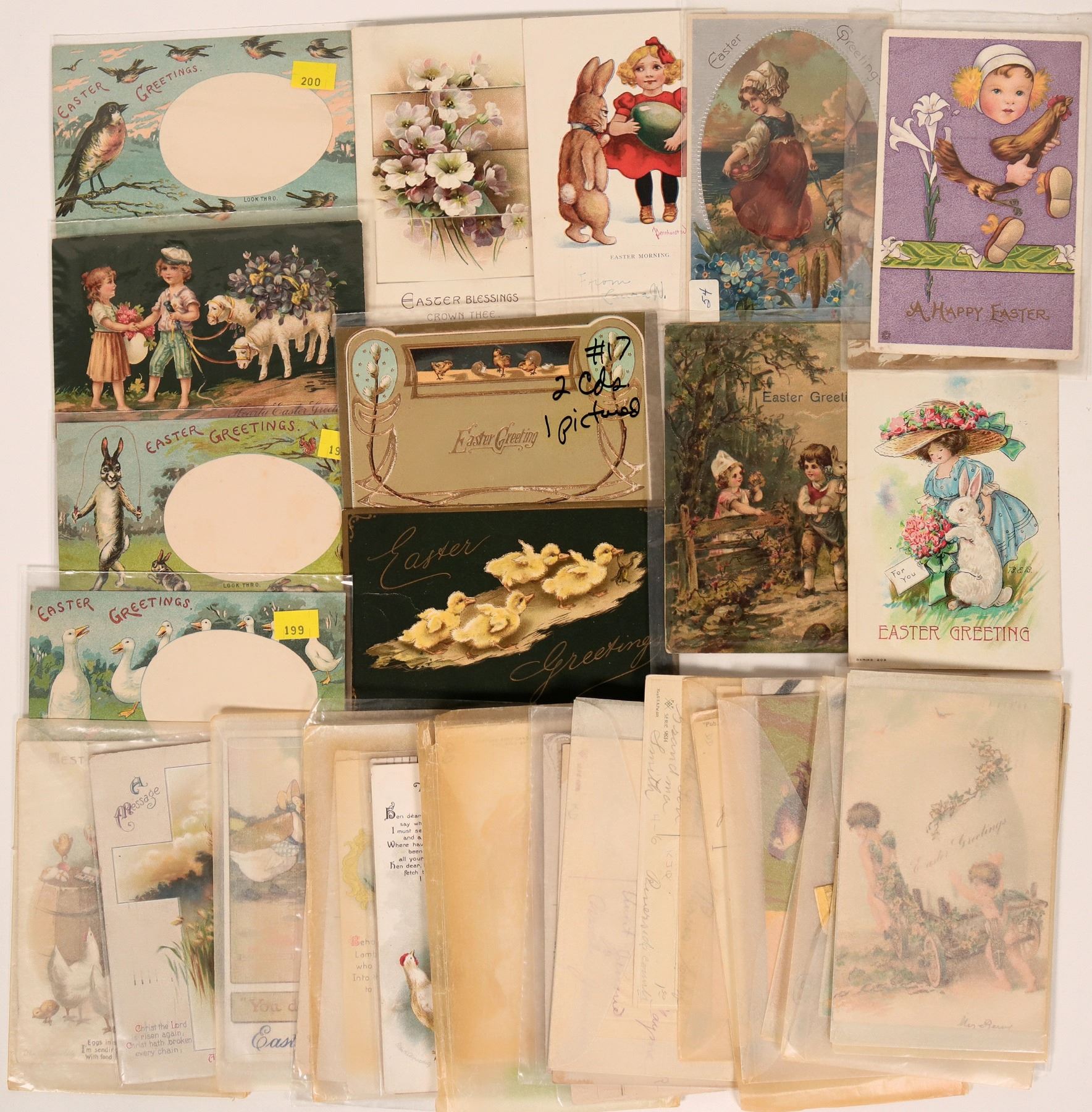 Large and varied grouping of Easter themed postcards. Includes one Tuck signed by Agnes Richardson. Includes eleven cards signed by Ellen Clapsaddle. Also includes a cute grouping of thirteen cute children postcards signed by Katharine Gassaway. See photos for more.