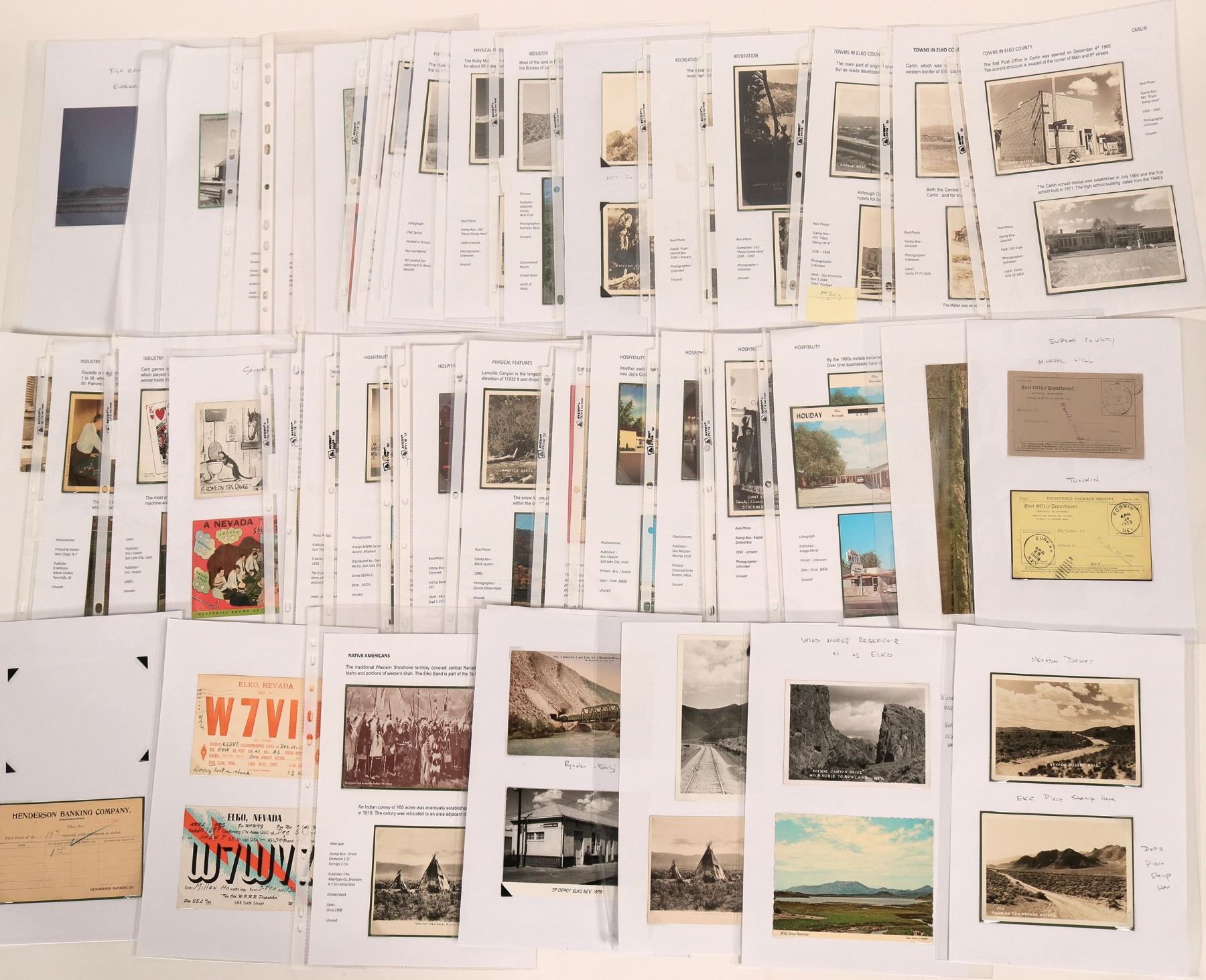Lot of 80+ that includes 35 RPPC. Group includes: Carlin (6); Wells; cattle and ranching scenes; wildlife (goats, bobcats, fishing); Humboldt River; desert scenery; railroad depots; Montello; Emigrant Pass; Primeaux; Palisade; Beowawe; Metropolis; gaming and hotel scenes; Native American; etc. These come from a collection where the cards were kept on pages with information and research. Please inspect!