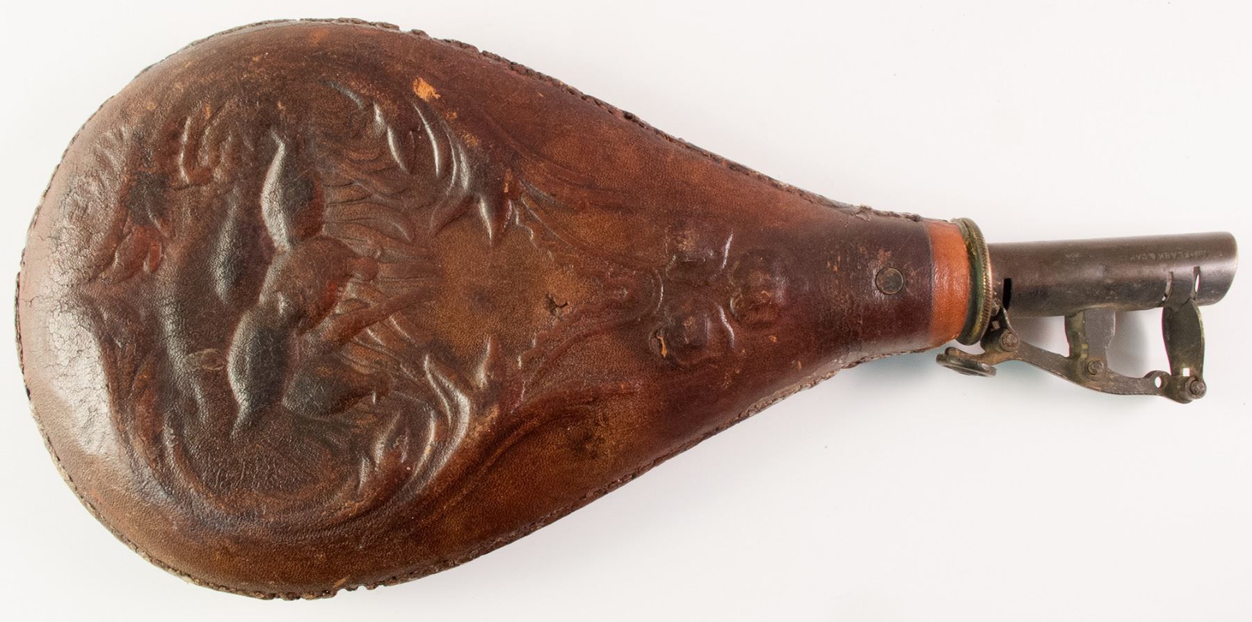 Large antique brown leather rifle/ shotgun flask. Embossed leather with game scene both sides, brass powder loader with working release. Very good working condition. Percussion rifle or shotgun. Flask marked 5 lbs for powder maximum. State: City: Date: ID# 39815