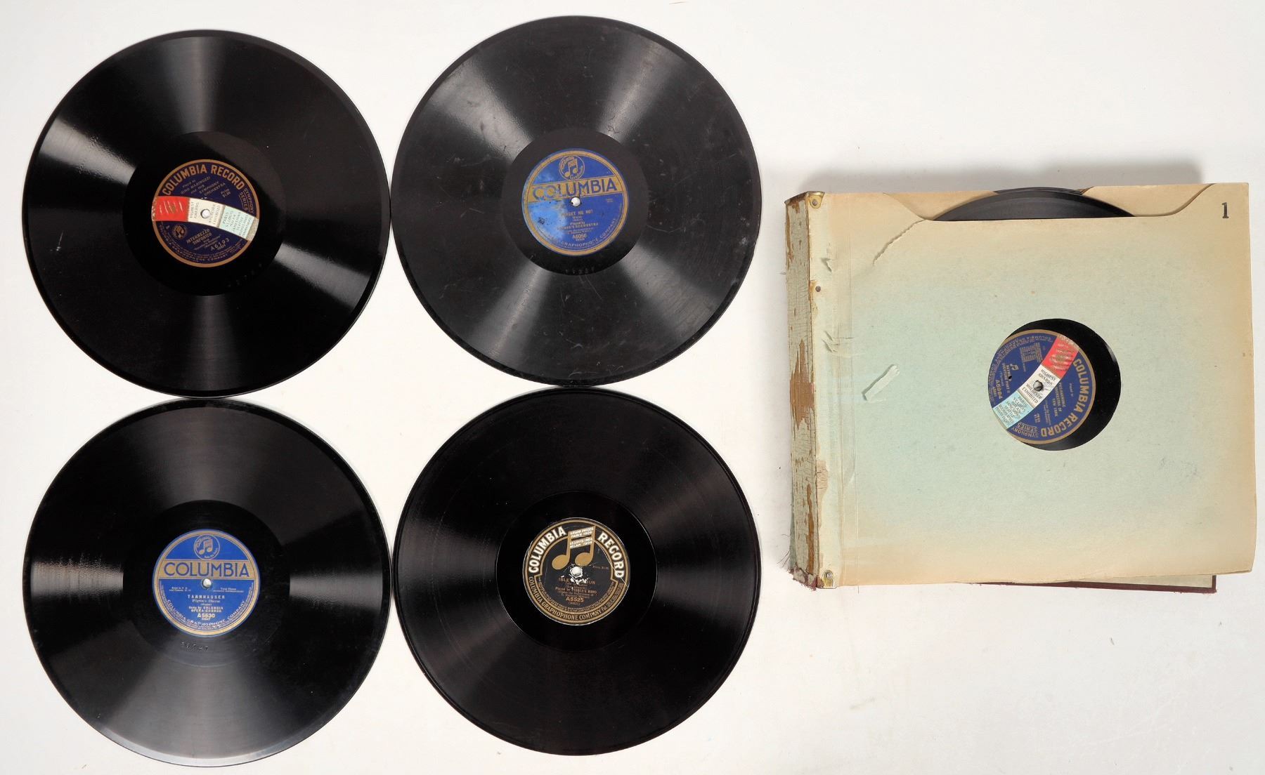 Group of 16 large format early '78 records, dating c. 1900-1905. All produced by Columbia. Labels at center have a ribbon design listing cities (incl. Paris, Milan, Buenos Aires, St. Louis). Three varieties included in lot, which are records with recordings on one side (3); very thick, two sided records (2); and standard records (8).Some have Graphophone label on reverse. Also includes 3 Columbia graphophone records. Varying condition, some heavily scratched.