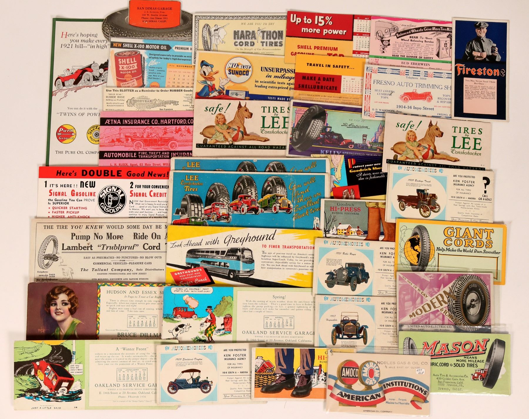 Includes a nice assortment of advertising for different tire brands as well as gasoline and motor oils. Famous company names include Lee, Kelly Springfield, Firestone, Goodrich, Amoco, Shell, Sunoco, Signal Oil and a really nice one from Purol Gasoline. Dating to 1921, it reads, "Here's Hoping you make every 1921 hill "in high". Many of these blotters are from California.