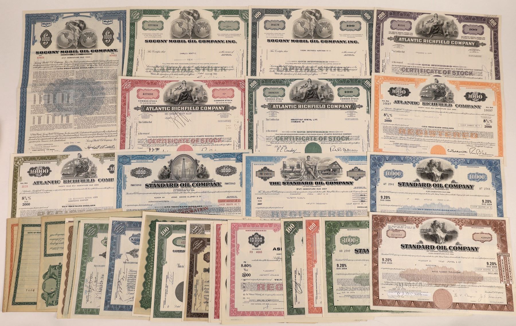 Lot includes stock certificates and debenture certificates from many famous oil companies. Includes two common stocks and six debentures from Standard Oil Company, two debentures from Shell Oil, one stock from Sun Oil, three different common shares from Mobil Oil, a debenture from Ashland Oil, three common stocks and two debentures from Atlantic Richfield Company, and two stocks and a debenture from Socony Mobil Oil Company. Also, there are three different bond certificates from Continental Oil Company, which are all Specimens. There are no duplications here. The multiples are different formats, colors and share quantities. Condition of all is VG+ to VF.