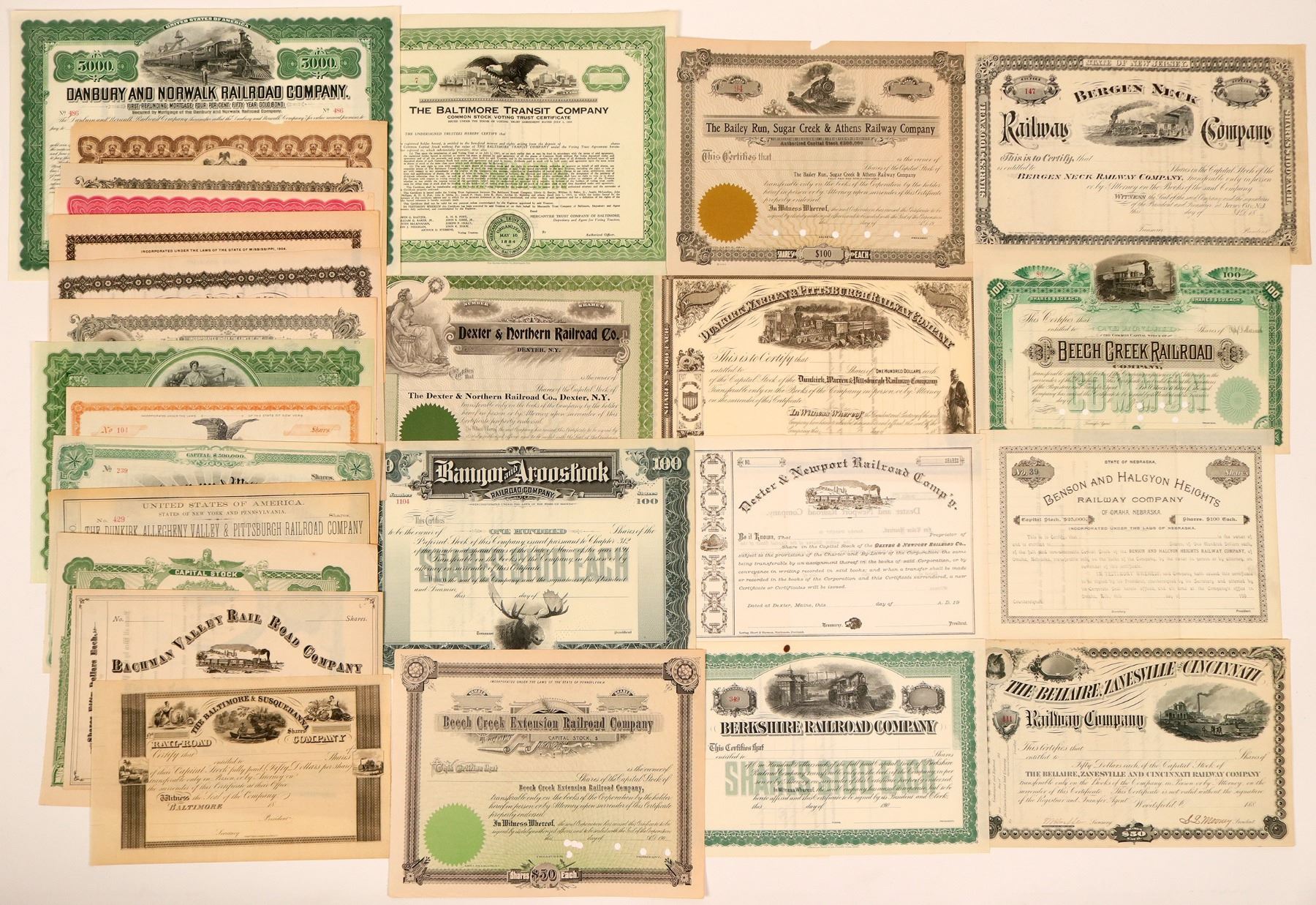 27 unissued certificates from railroads around the country. Good condition. View photos to inspect this lot.
