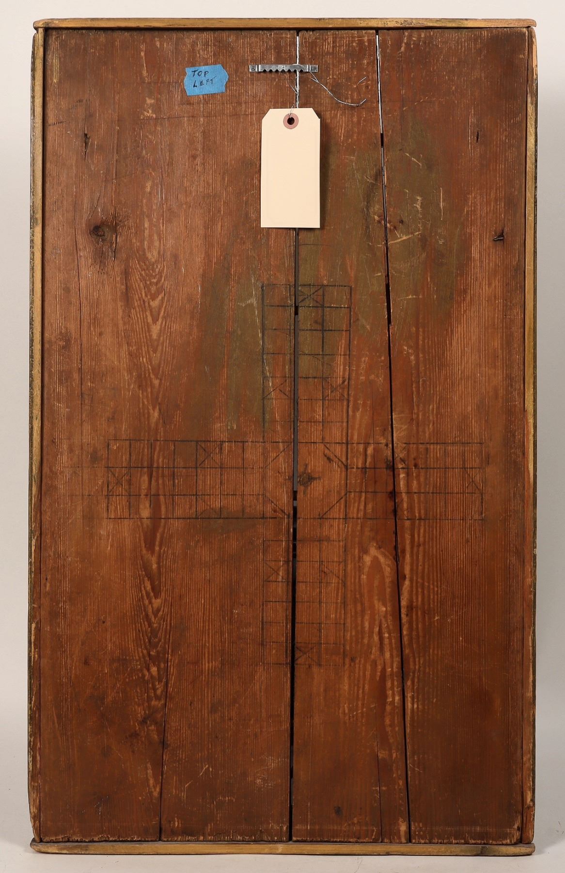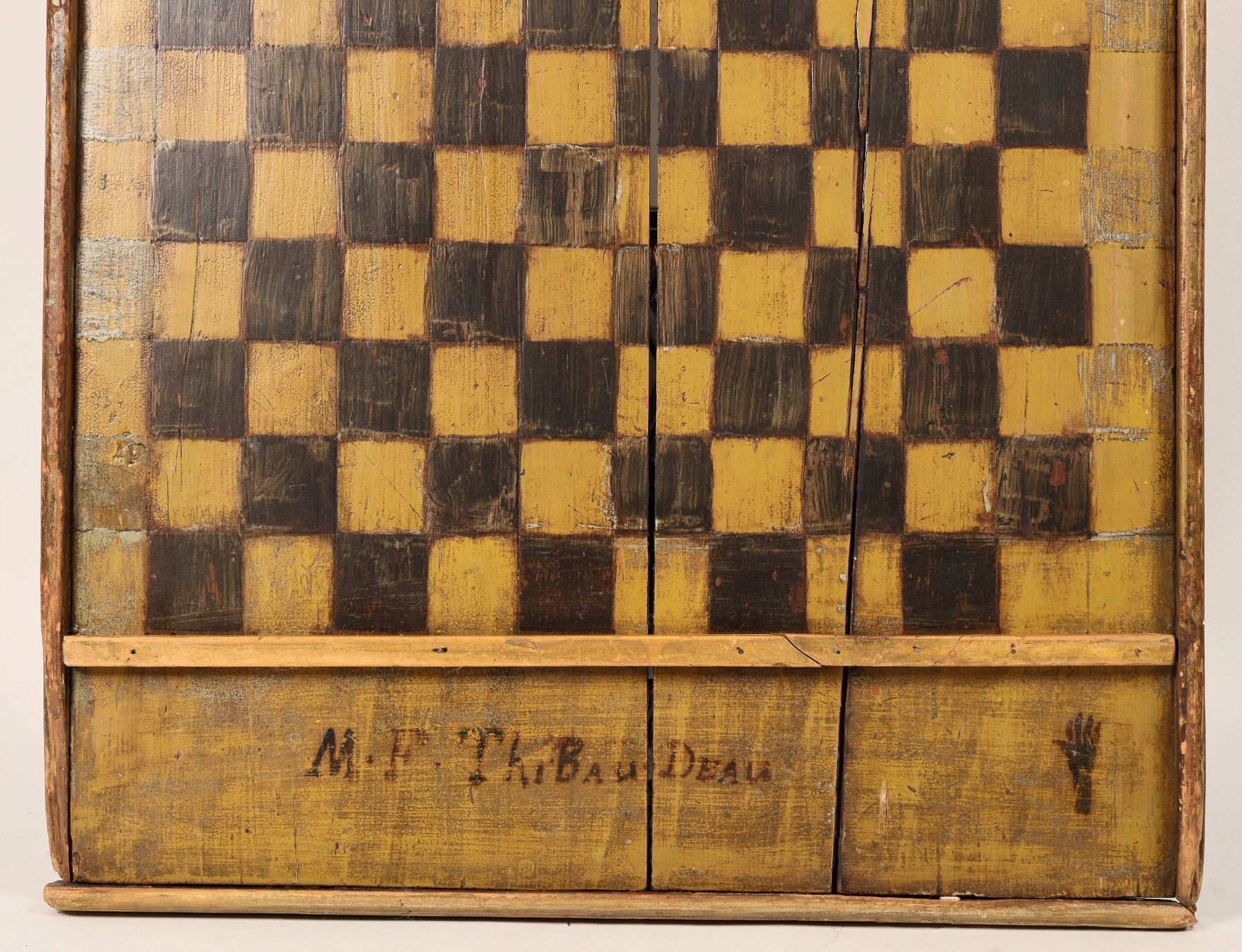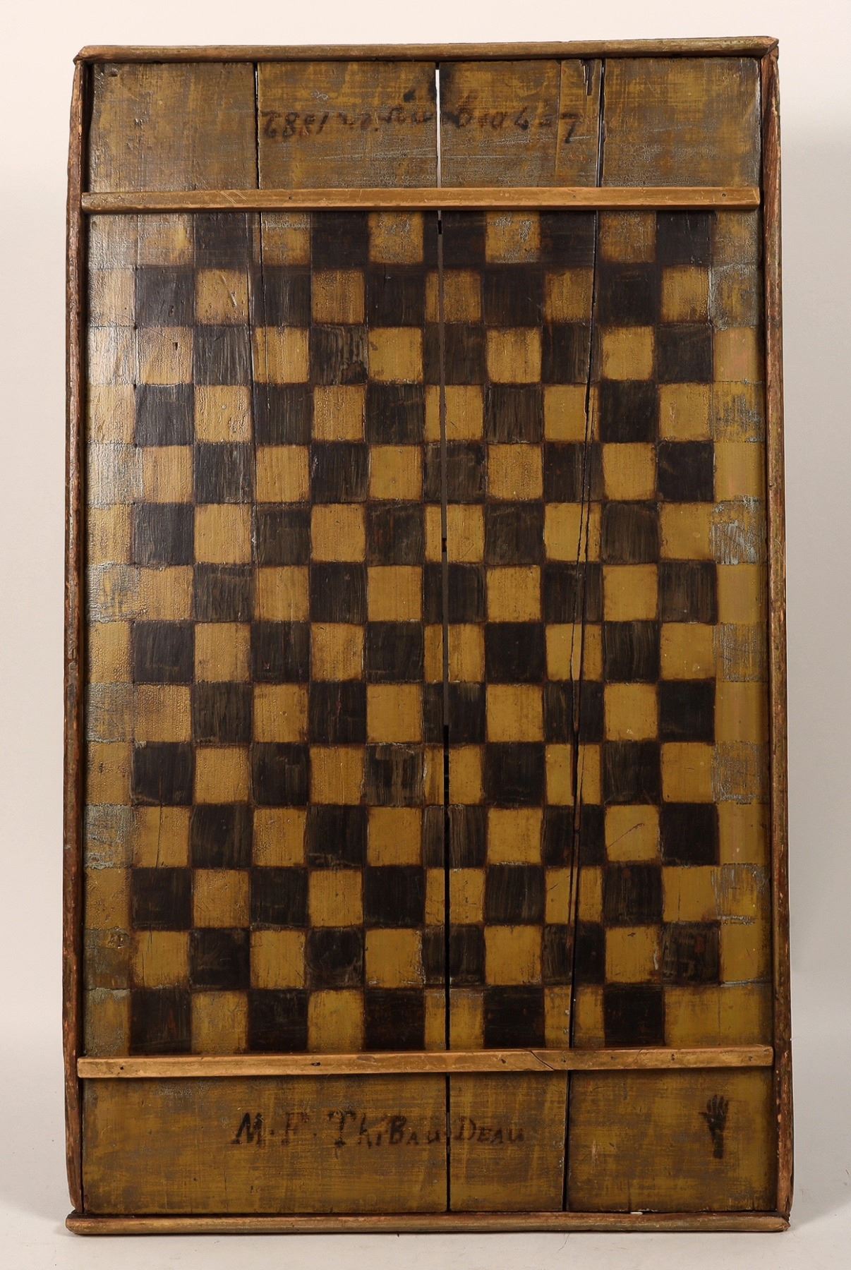 Large handmade chess or checkerboard. It measures 18"x 30" and has chessmen/checkers trays on either end. There are long age cracks down the middle. It is marked 1882 and the reverse shows a sketch of a parchisi board. Still in playable shape or as a wall hanging. Please see photos for more details.