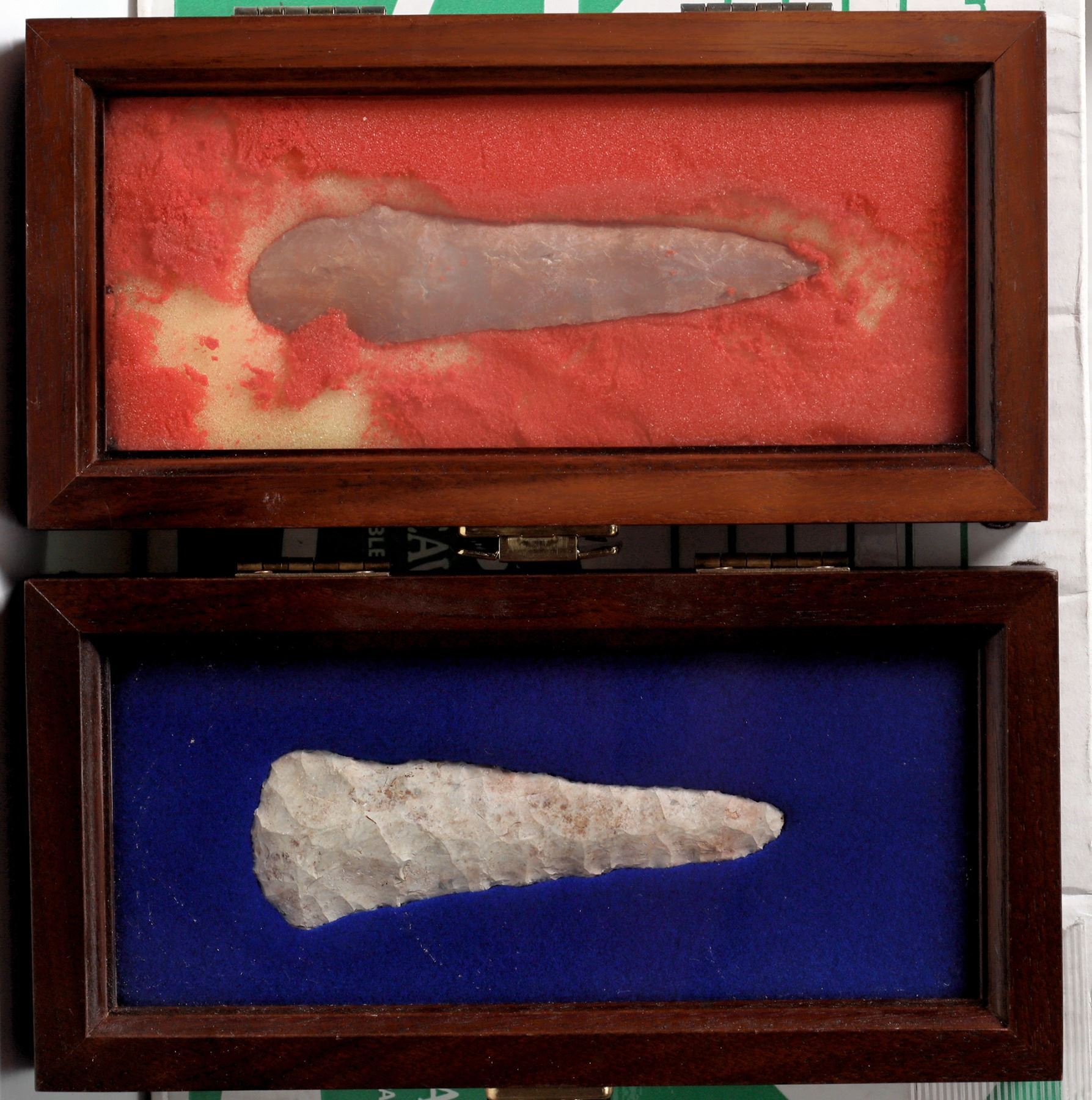 This lot has five knife blades from Oklahoma and Kansas. There are three blades from Kay County, Ok. A gray double beveled knife from the Arkansas River near Ponca City 5.25 in./ 134 mm; a blade from lower Beaver Creek 5 in./ 127 mm, the last blade is from the Chikaskia River, Braman, Ok. 4.5 in./ 114 mm. There is a pink blade from the Arkansas River, Crowley County, Ks. 5.75 in./ 146 mm. The last blade was found in Bemis Creek, Butler County, Kansas 5 .25 in. / 133 mm. From the Gary Bracken collection. Please see photos for details. Certificates of Authenticity may be available for some of the pieces in this lot. State: Oklahoma, Provenance: Gary Bracken Collection