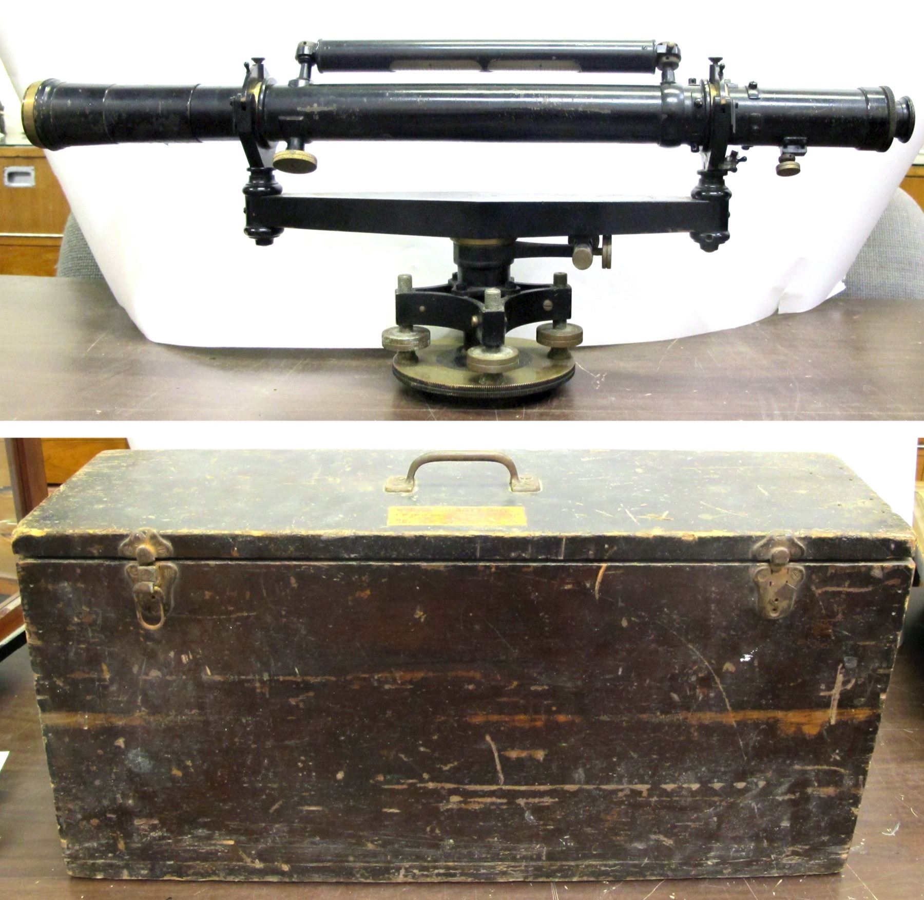 In Wigton-Abbott, NJ wood box. Interior label for Charles Prandoni, repair service of surveying instruments, Hoboken, New Jersey, circa 1930. Approximate 24 inches long K & E level with tripod mounting. No model number visible. Initials SJS on standard. The instrument appears to date to pre-1920. Contained in large wooden box, as original. Classic long-distance level device for serving.