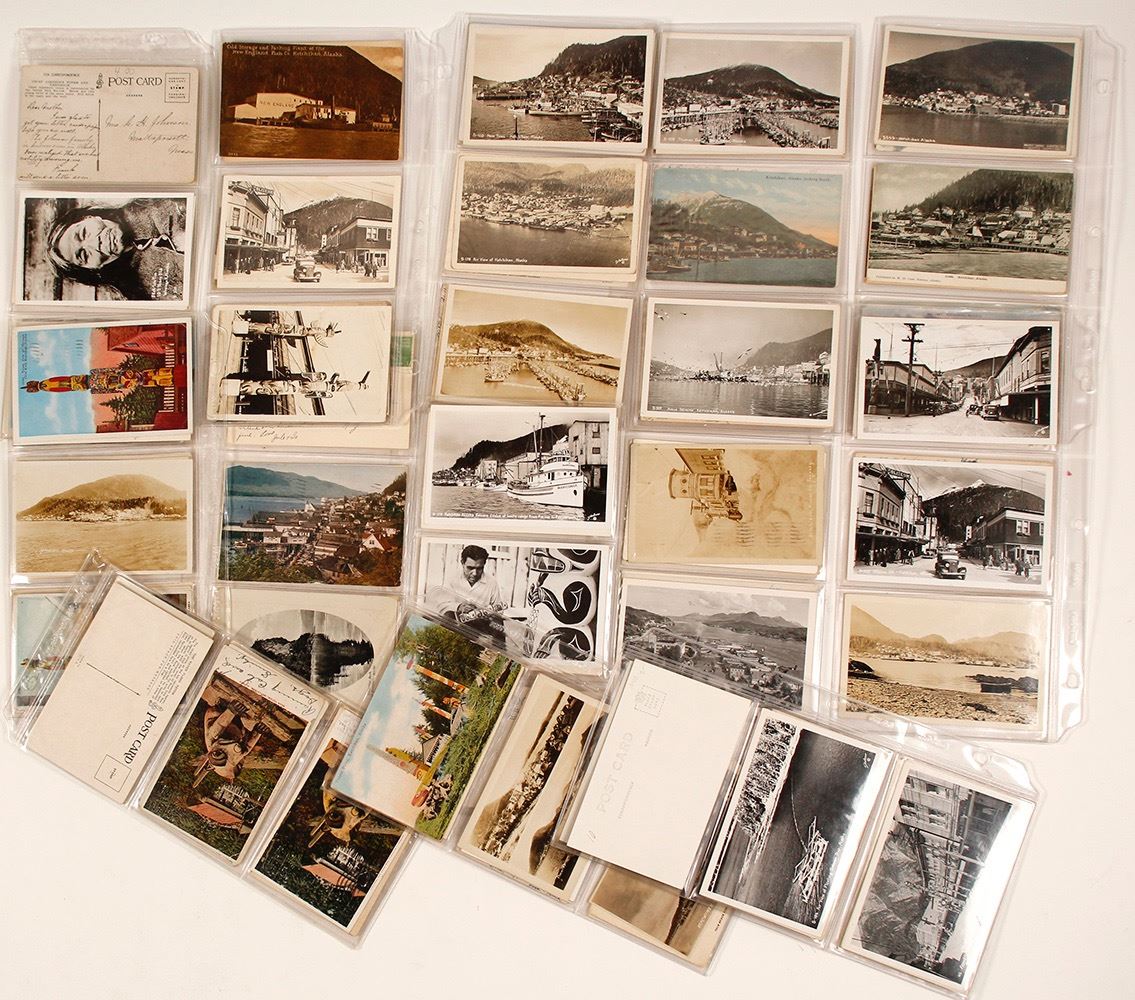 Approx 123 postcards of various themes which appear to be different including RPC's and chromolitho. Impressive 9 lb record king salmon, Ward Cove Creek, many totems, Ingersoll Hotel , 101 yer old native, Eddystone Rock, New Town Harbor, Thomas Basin and more. Date: c. 1906-1950 Location: Ketchican, Alaska HWAC# 58726