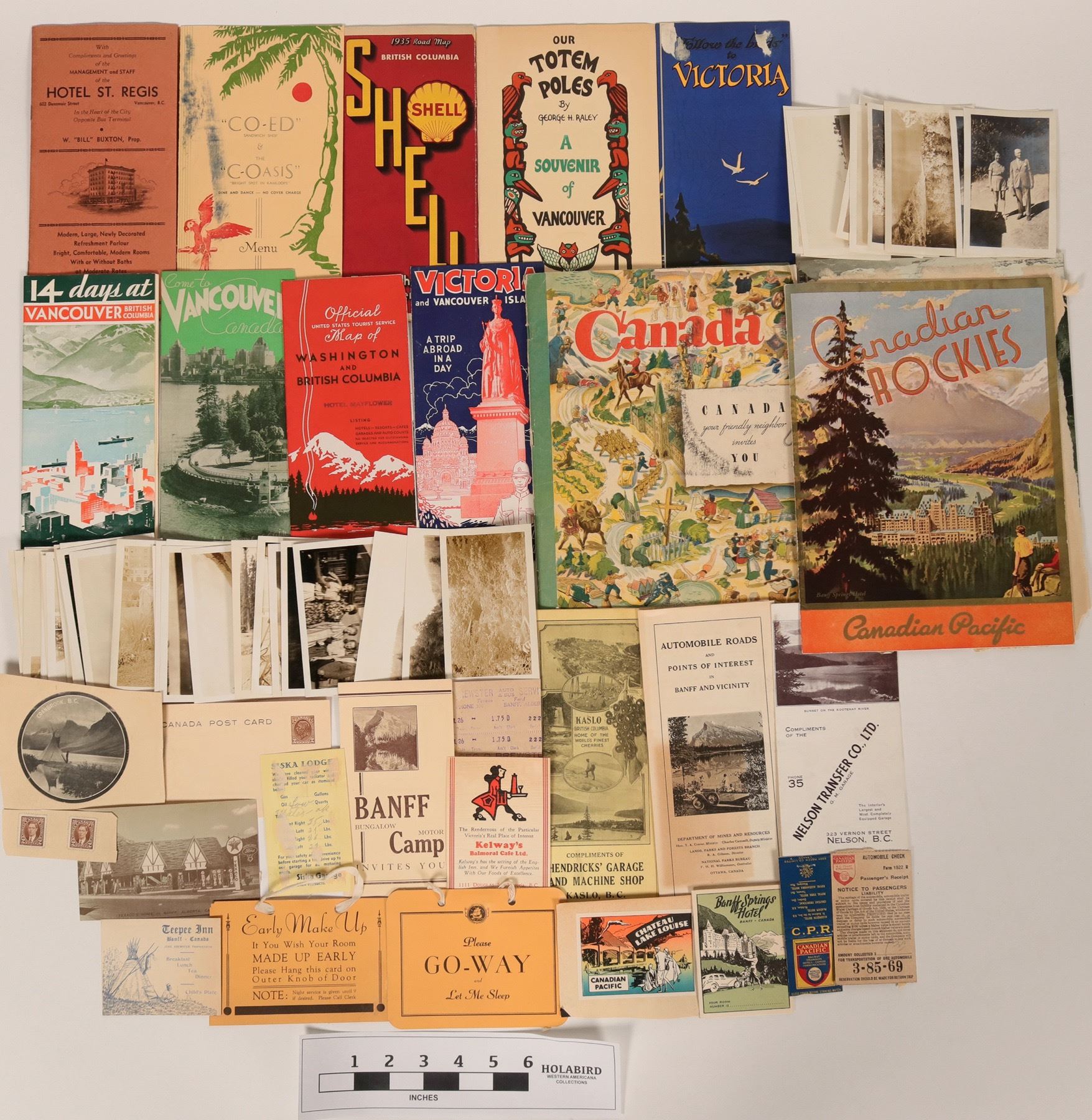 Lot of 68 is a travel archive of Canada from the 1920s-1940s. Includes 30 publications, brochures, tickets, menus, postcards, matchbook covers and maps, and 38 photos. Items include a map of British Columbia, brochures about Victoria, totem poles, Hotel St. Regis in Vancouver, Banff Springs Hotel and much more. Some items came out of a scrap album. See photo for details.