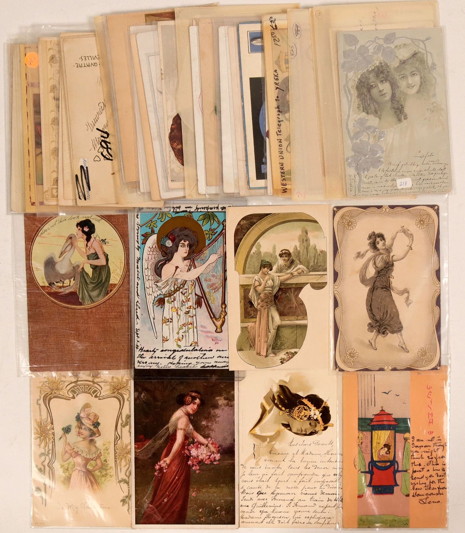 This diverse group of postcards features women in fancy apparel, women holding animals, and more. Includes one Tuck card signed by Maud Goodman, "Thinking of Somebody," #8651. Also includes a cute card of a dolled up woman holding a gray cat, signed by Sewell Collins, "Disturbers of the Peace," #2591. Two postcards of note feature fancy women with large cocktail glasses that match them in size, which are signed by S.L.S., Detroit Publishing. See photos for all the beautiful artwork.