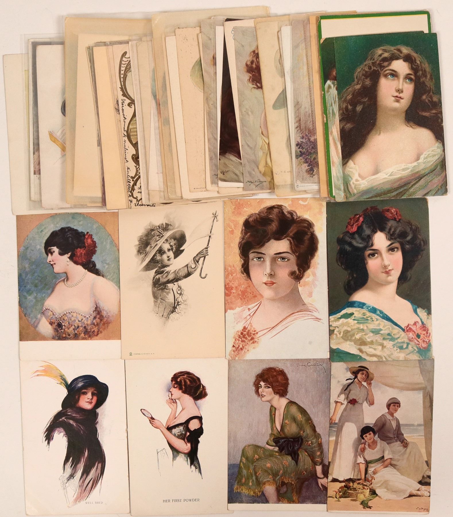 This beautiful collection of women features women in hats and wearing more formal apparel. Includes two cards signed by Court Barber; one of a "Well Bred" woman and another applying powder, "Her First Powder." Includes one card signed by T. Corbella with a lovely lady in a lilac gown. See photos for the exquisite artwork on these postcards.
