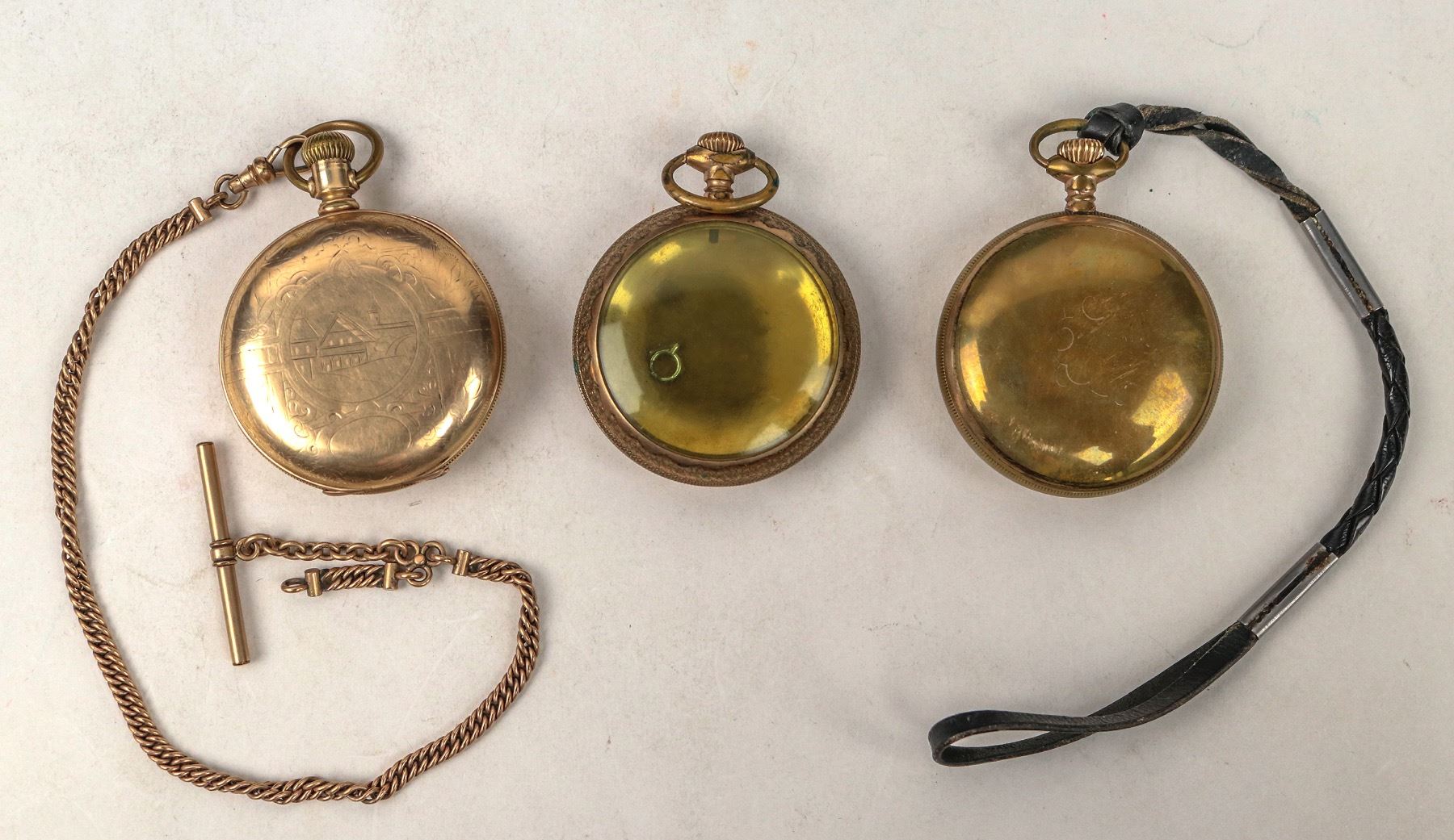 Two large pocket watches: Hampden Watch Co.; roman numeral dial, 12 inch long chain tests 10 carat gold; Hamilton with leather strap. Also an empty watch case. All three are two inches in diameter.