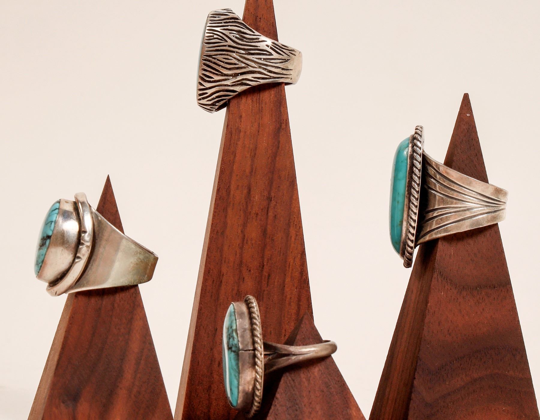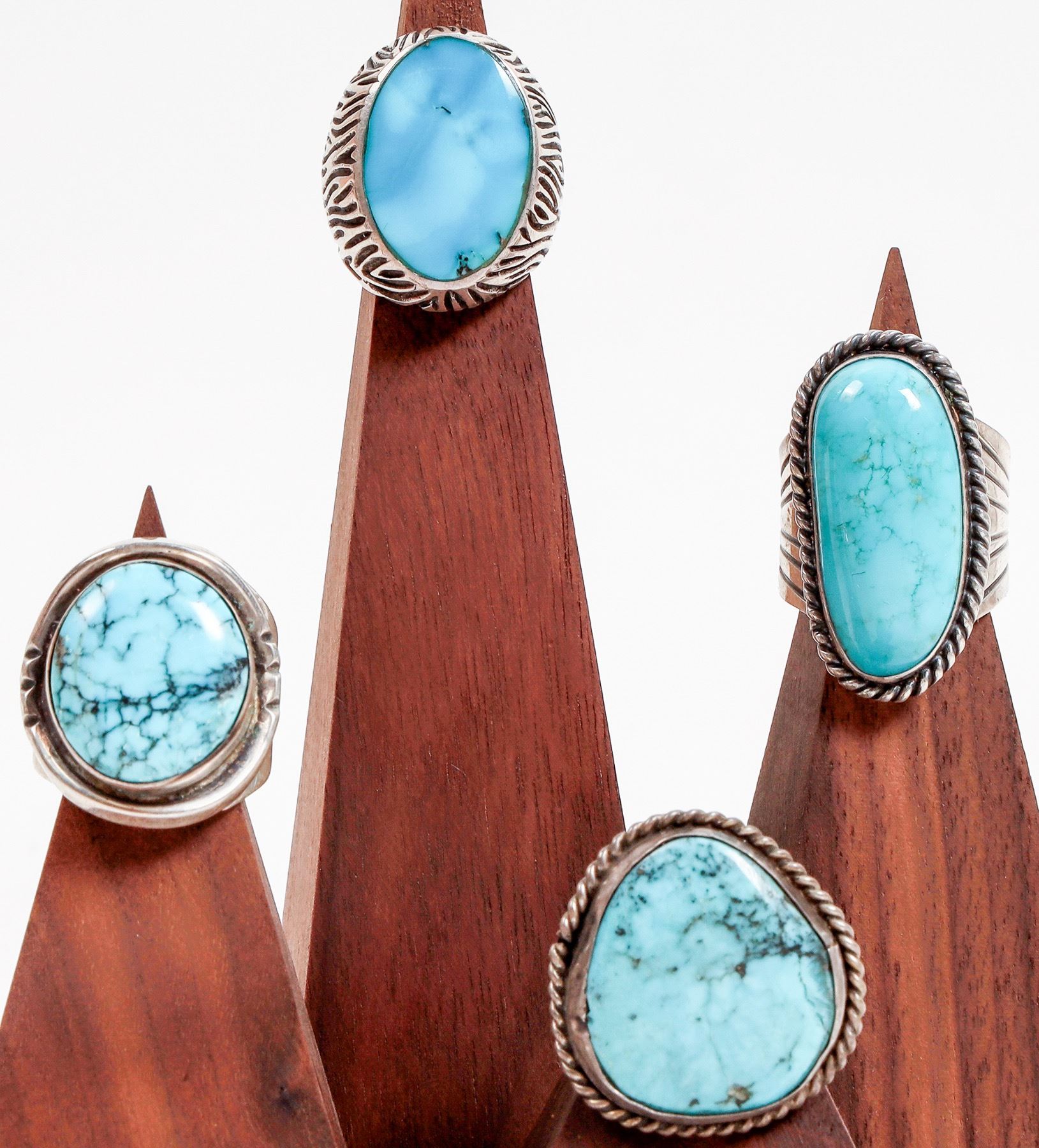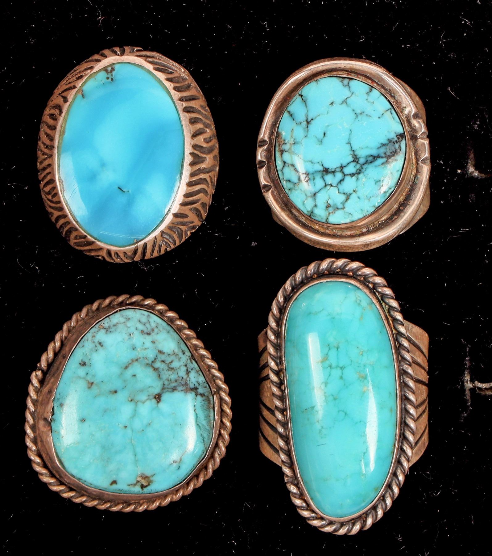 Four large sized men's turquoise and silver rings. Ring sizes as pictured from left to right: 9, 8, 8, 10 [] [] [] [] []