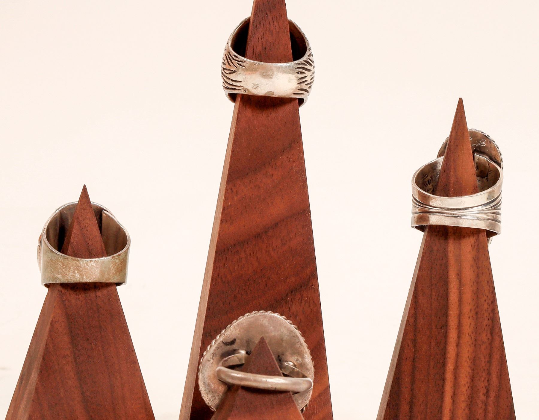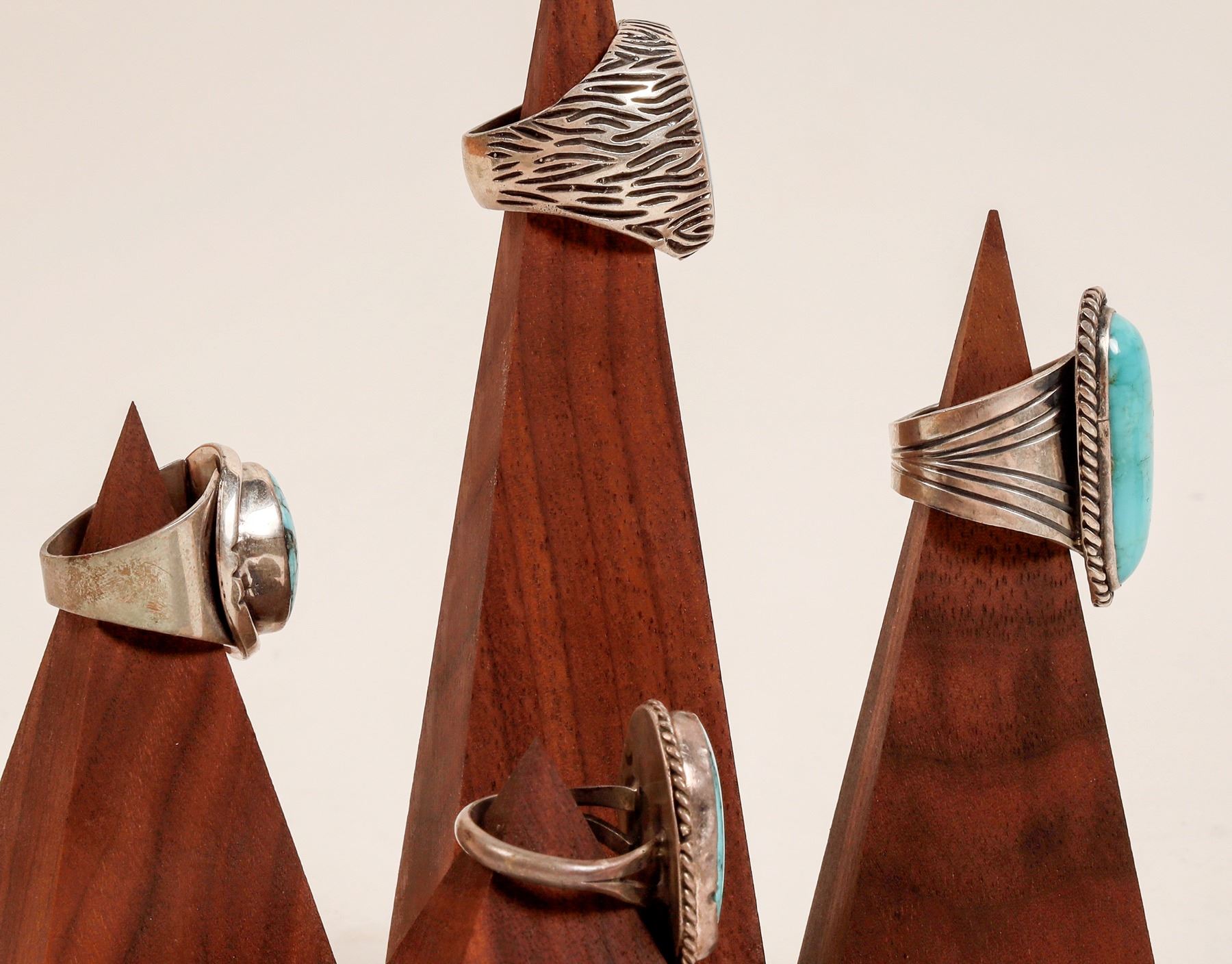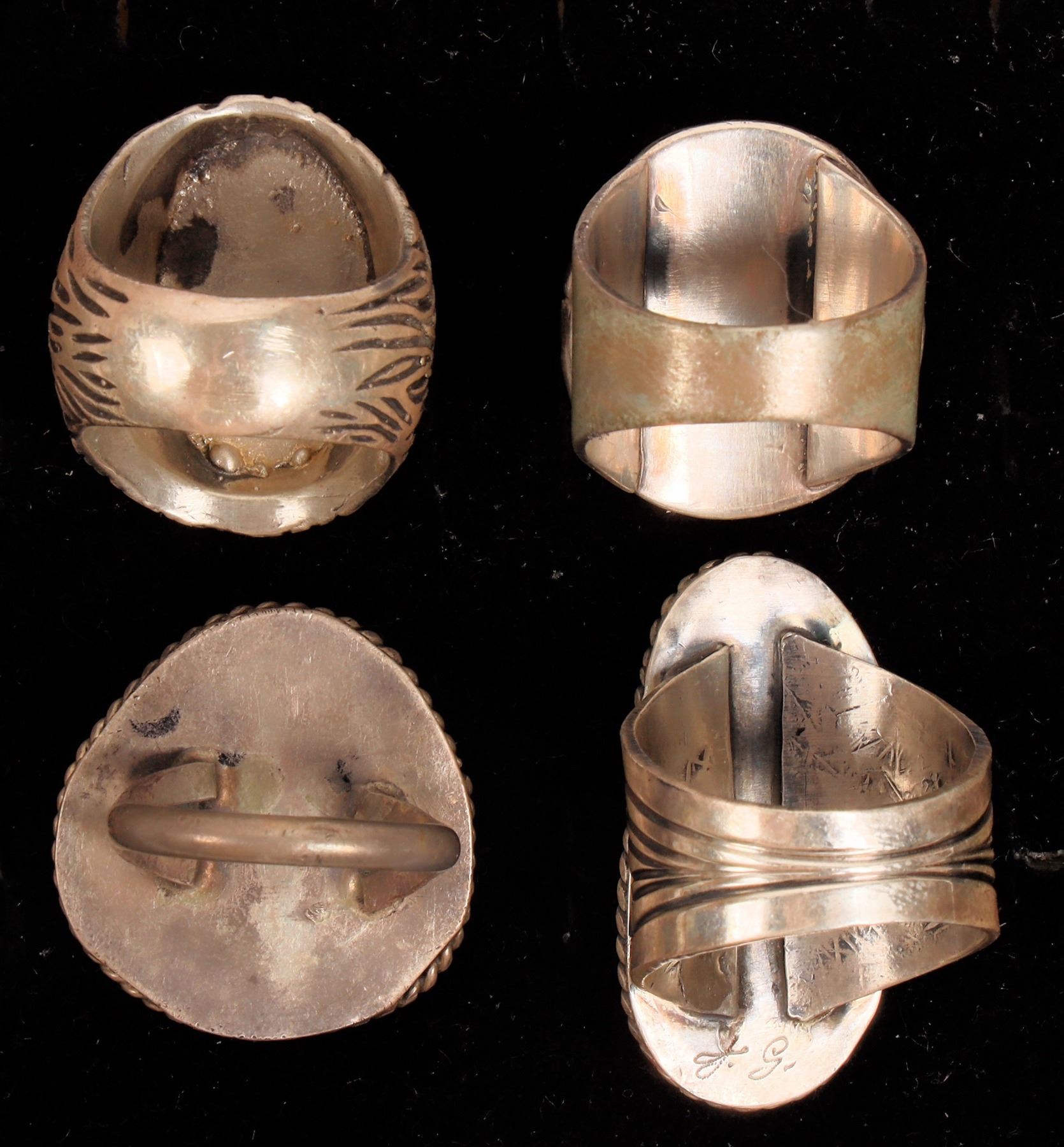 Four large sized men's turquoise and silver rings. Ring sizes as pictured from left to right: 9, 8, 8, 10 [] [] [] [] []