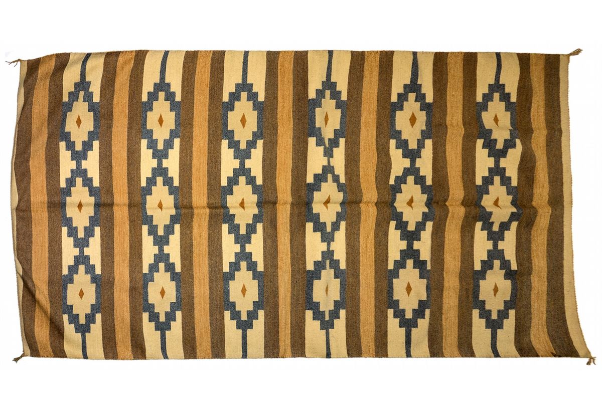 Measures approx. 78" x 56". This regional Navajo Rug style is named for the town of Chinle (It flows from the canyon.) at the mouth of Canyon de Chelly. The Chinle style was developed by Mary Cabot Wheelwright and Cozy McSparron, a trader at Chinle. They sought to revive weaving using classic period designs with vegetal dyes. The Chinle characteristics are horizontal bands containing Chevrons, Chinle Stars, Squash Blossoms and Diamonds in muted colors of gold, green, tan, ivory and pink. Trader Leon H. (Cozy) McSparron is responsible for the Chinle style rug. His experiments with dyes both vegetal, and commercial, provided impetus to his weavers to revive the simple stripes and bands of the Early Classic Period, (1700-1850). The modern Chinle rug has maintained the McSparron suggestion and today reflects the combination of both vegetal and aniline dyes. It is generally considered; however, that the contemporary Chinle is basically vegetal. Commercial dyes are used sparingly to outline or accentuate the smaller designs. The borderless rug has a spacious feeling with small terraced designs and squash blossoms encased in broad bands. Some of the intervening stripes use the Crystal "wavy line" techniques. The weavers in the district create an attractive rug of pleasant balance. Natural white wool usually provides the background, with less used shades of vegetal-dyed green, brown, and gray. Rose colors and yellows are favorites, along with aniline black to denote outlines and termination panels at the ends. The rug is distinctive and well-woven. Some pieces must be closely examined to distinguish them from a Crystal or Wide Ruins. One of the keys is the color utilization, part vegetal and part aniline. Also, the weave is somewhat heavier than its all-vegetal neighbors.