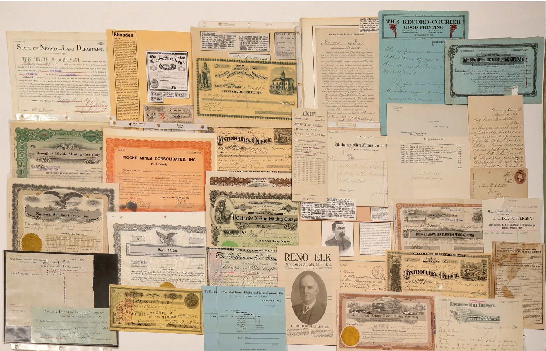 Lot of 50 items. 1) Stocks: Bullion & Exchange Bank to Mrs. Richard Kirman, 1901; Ruby Hill Tunnel & Mining Co. (Eureka, 1883); Union Amalgamated Extension MC (Tonopah, 1917); Reorganized Belcher Divide MC (Tonopah, 1927); Cash Boy Cons. MC (1915); Brougher Divide MC (Tonopah, 1934); Pioche Mines Cons. Inc. (1929); National Smelter Corp. (1927); and Suite 116, Inc. (8 unissued). 2)Billheads/Letterheads: AW Campbell (Eureka, 1882); PN Hansen (Eureka, 2x 1883); Riverside Mill Co. (1900, Reno); Cache Valley Condensed Milk & Creamery (1907, Reno); Wood Curtis & Co. (1907, Reno); Douglas County Bank (1901, Gardnerville); Minden Inn (1920), Douglas County Creamery (1894); Manhattan Silver Mining Co. (Austin, 1869); etc. 3) Other including State Warrants, land deeds, an 1883 Carson City letter and cover, Belmont 1884 Money Order, and more. Please inspect.