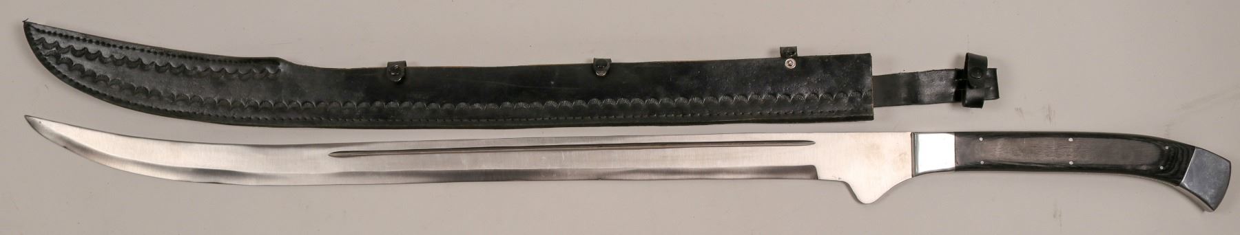 45" long sword stamped Pakistan, stainless steel with gray wood grips and stamped scabbard