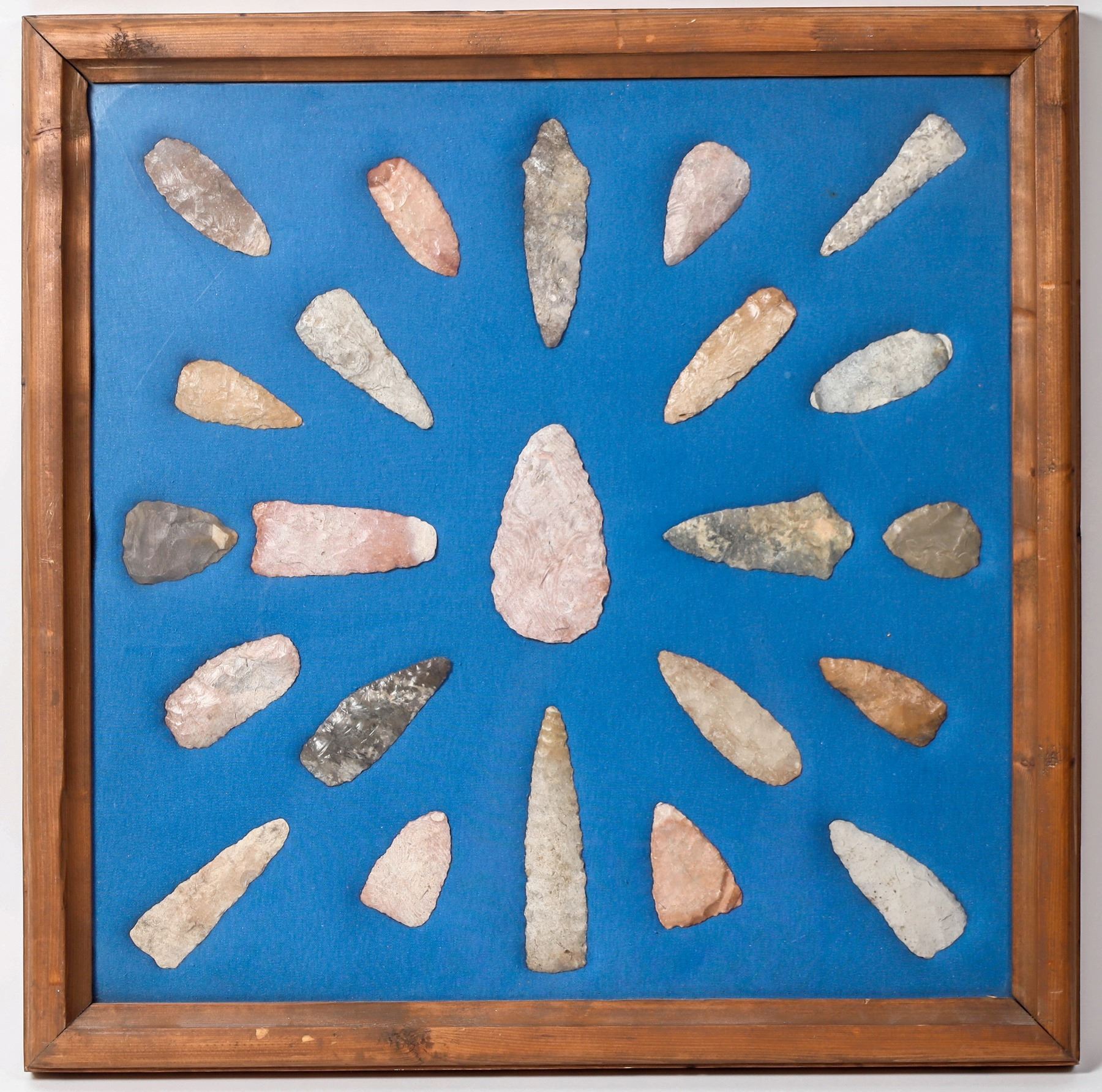 This collection of large projectile points spans a great window of time. There is one point that has one shoulder at 90 mm in lengths. The pieces are thought to be from the Oklahoma-Arkansas area. With Cody complex is Scott's Bluff, Eden, Alberta, Cody knives, Red River knives. Pieces range from 2.125 in/ 53 mm to 5.5 in./ 140 mm in size. All pieces are spectacular and intact; white tipped, pink, ash, and gray colors. From the Gary Bracken collection. Beautifully displayed in a pine frame at 23 in. x23 in. Please see photos for details. State: Arkansas, Provenance: Gary Bracken Collection