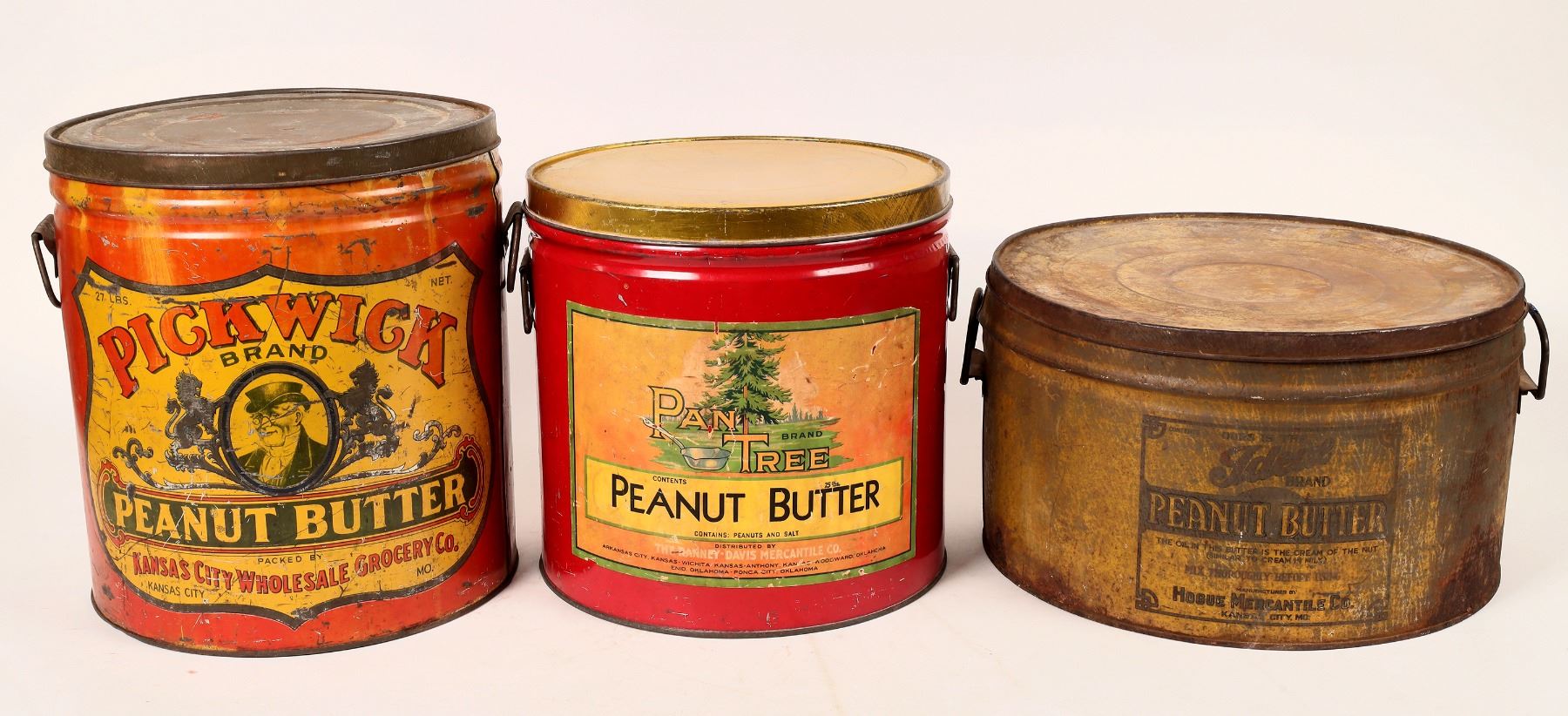 3 large peanut butter tins with lids and handles. Yellow Ideal, Kansas City, 7.25", faded and reust. RedPan Tree, Kansas/Oklahoma with paper label 9.5". Pickwick, Kansas City, MO. 11', some paint loss. Please inspect. Kansas City Missouri Gary Bracken Collection