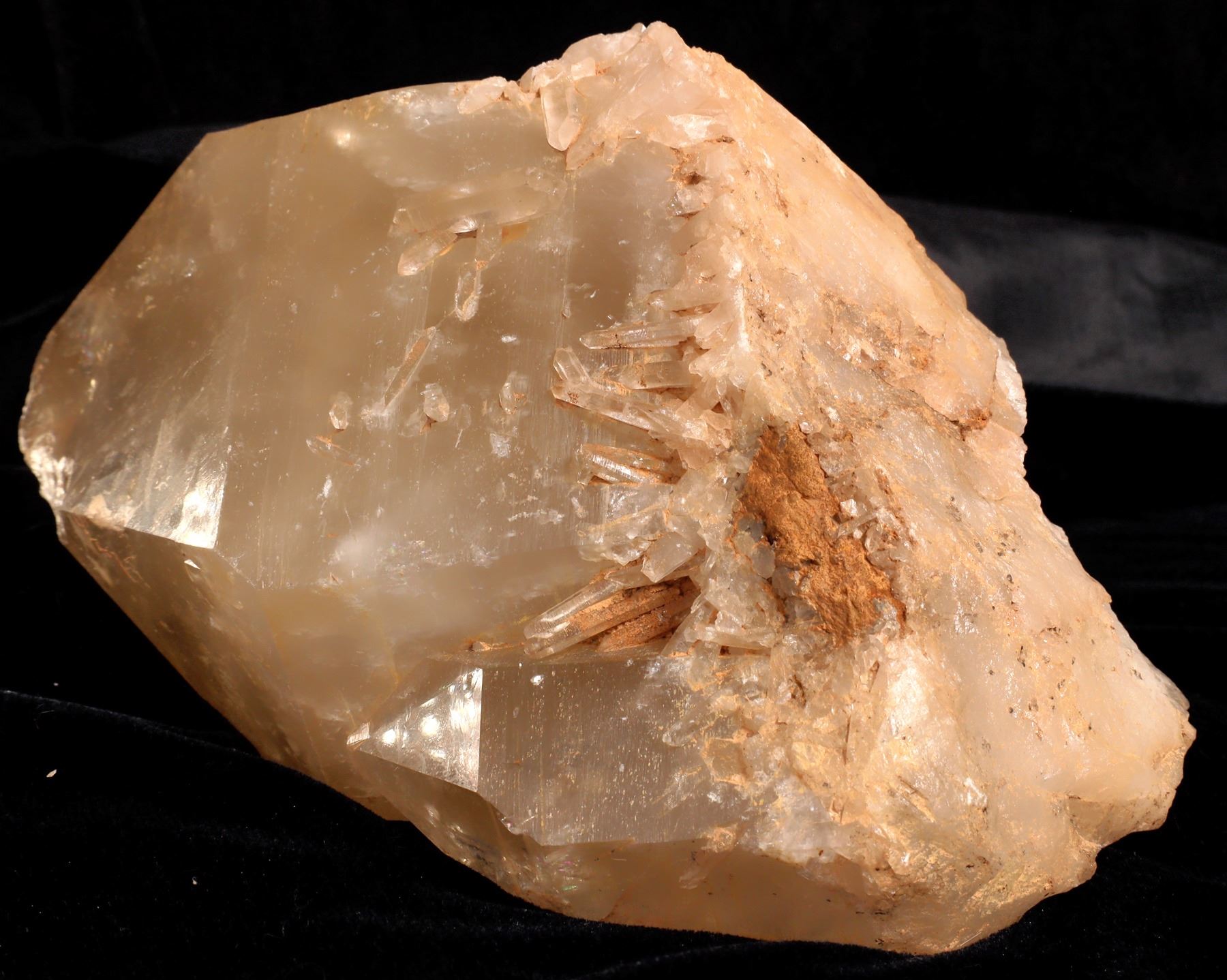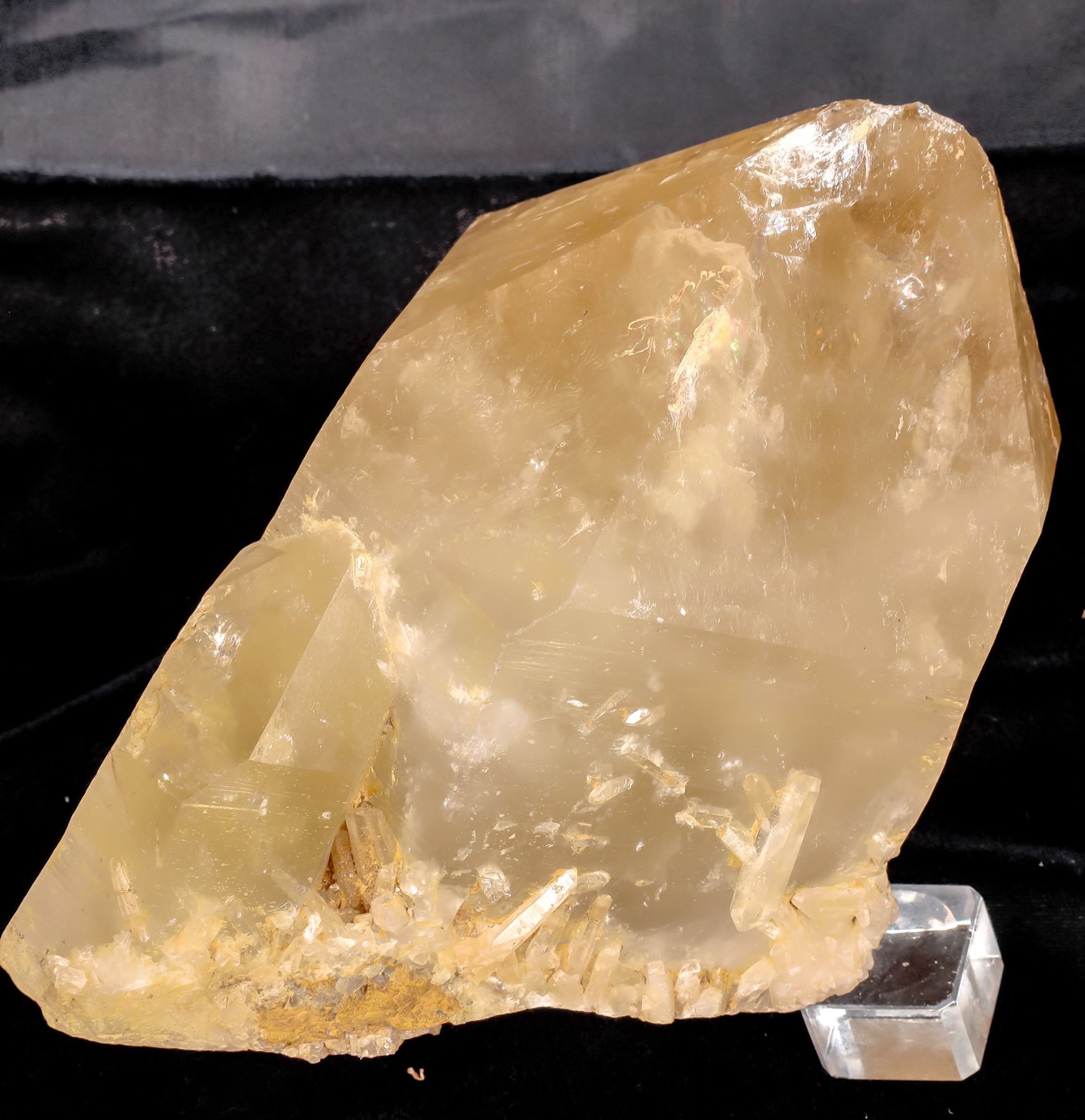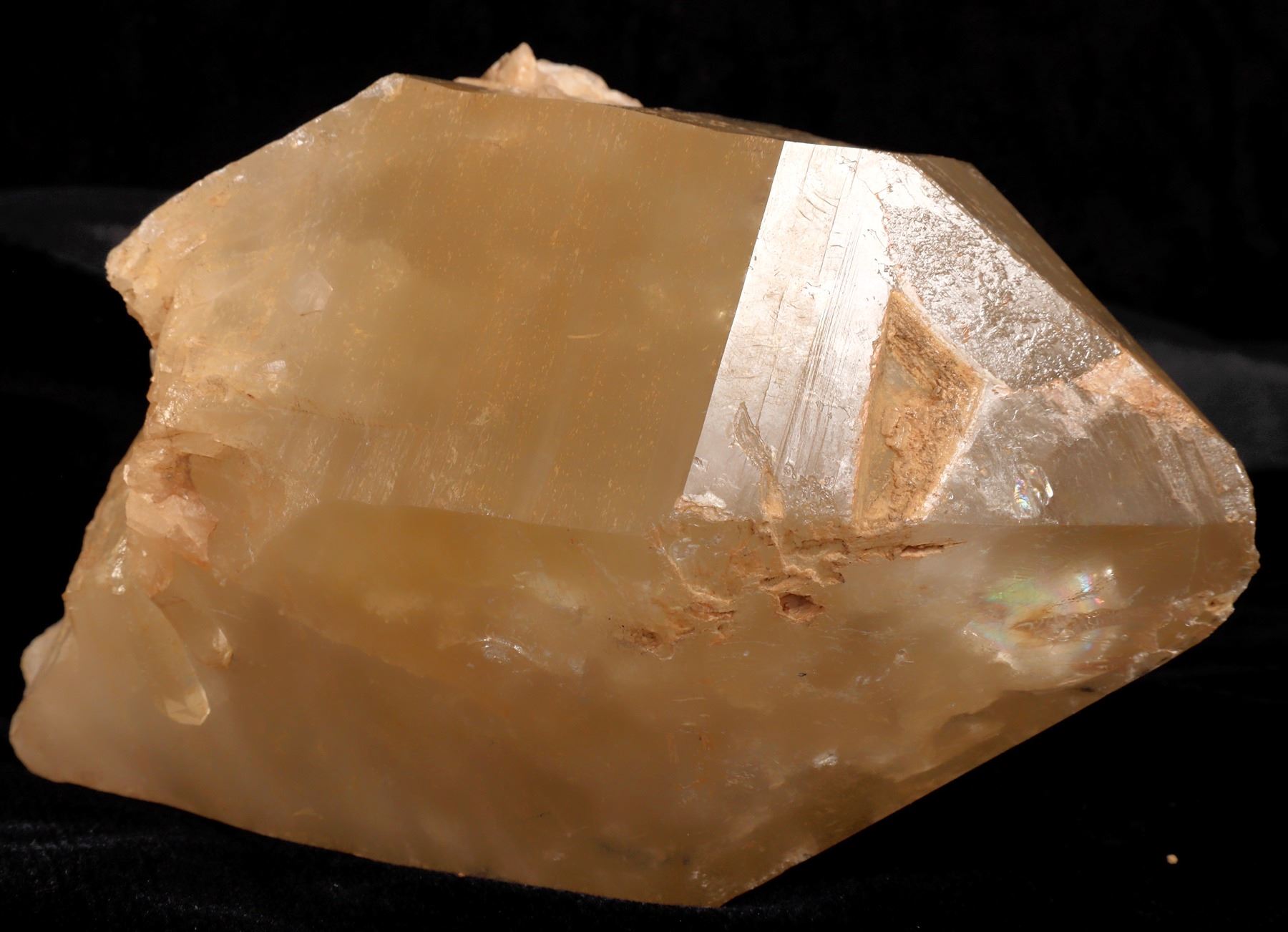Lot includes 1 very large prismatic clear quartz crystal (approx. 7.5x5x4.75") , rhombohedral, slight iron staining in patches, few indications of minor dissolution, small negative imprint near top, clear at tops transitioning to milky at base, with milky patches, iridescence patches, chip on top facet, shows intergrowth of crystal sprouts at base and incorporated into main crystal, has several daughter crystals. This is a massively large quartz crystal, a showcase specimen for any collection. Natural growth lines evident on all facets. Chunlin Collection.