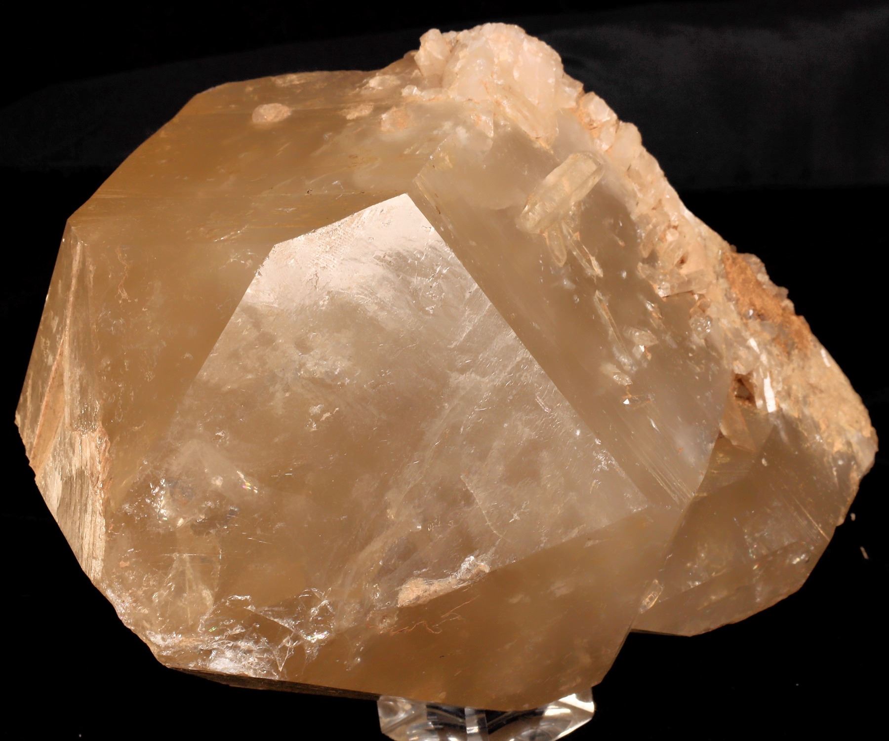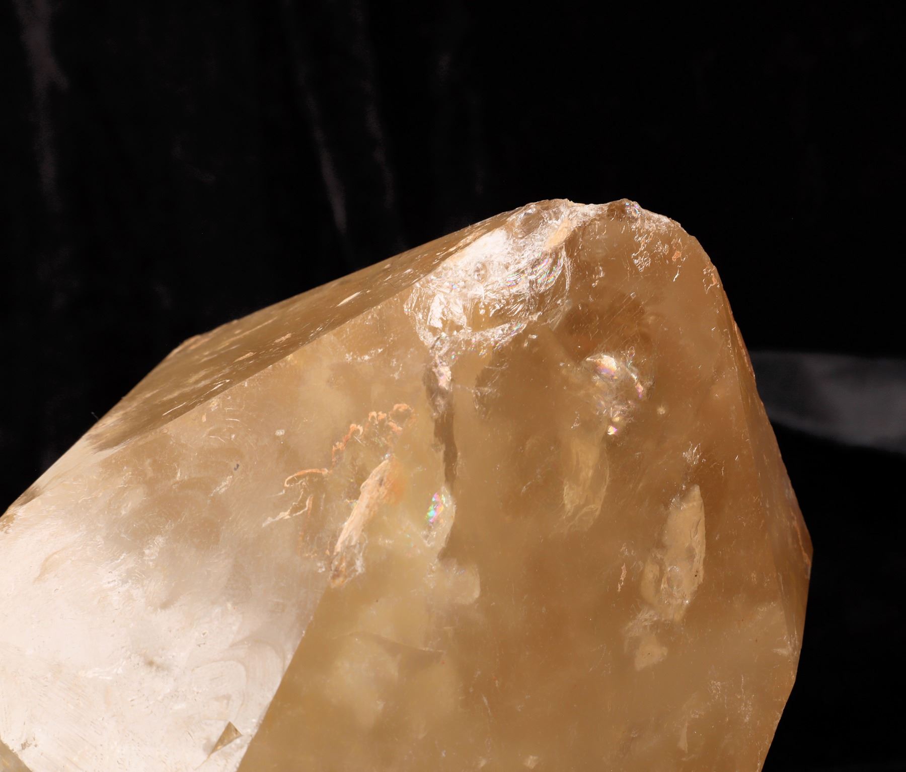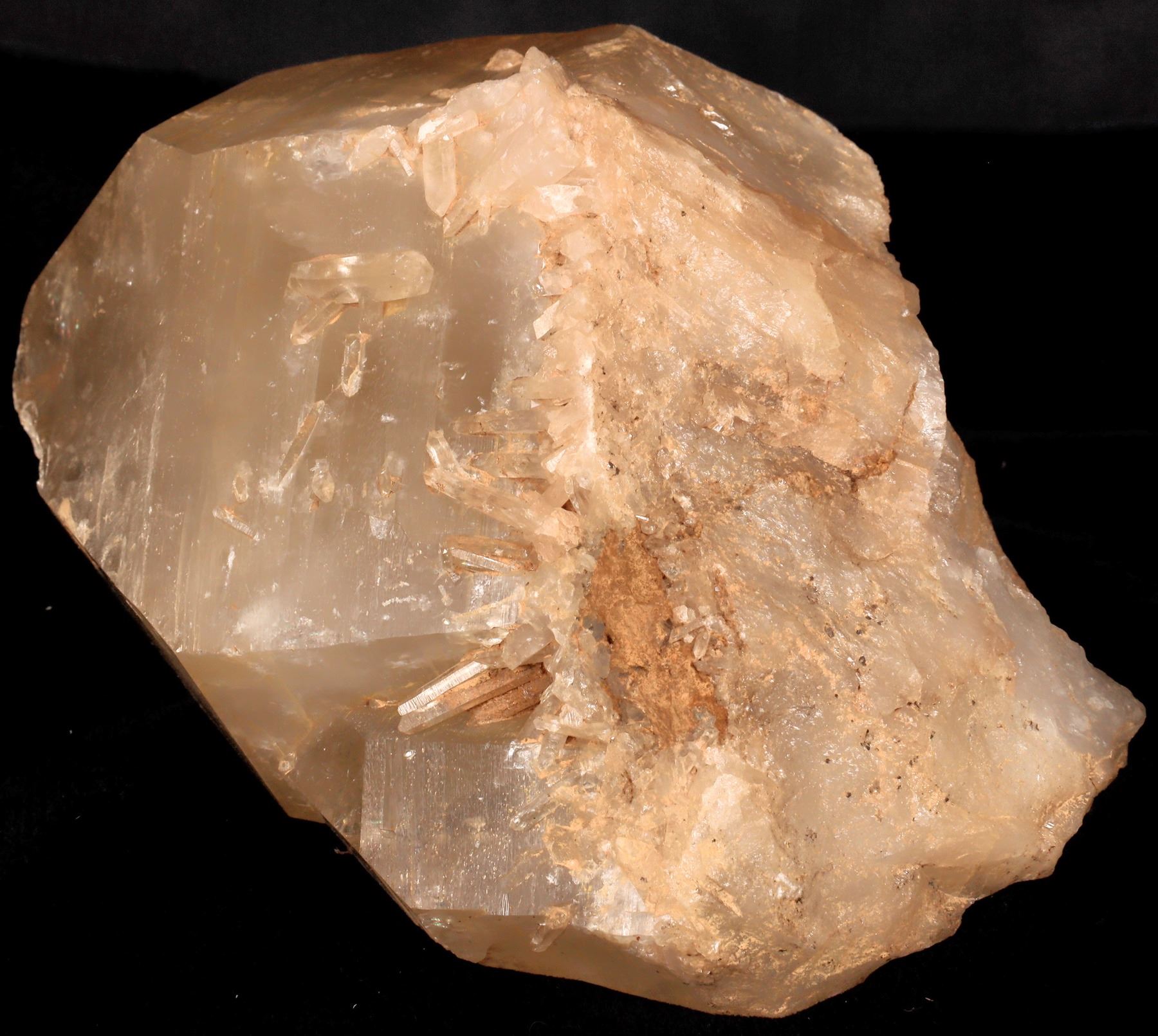 Lot includes 1 very large prismatic clear quartz crystal (approx. 7.5x5x4.75") , rhombohedral, slight iron staining in patches, few indications of minor dissolution, small negative imprint near top, clear at tops transitioning to milky at base, with milky patches, iridescence patches, chip on top facet, shows intergrowth of crystal sprouts at base and incorporated into main crystal, has several daughter crystals. This is a massively large quartz crystal, a showcase specimen for any collection. Natural growth lines evident on all facets. Chunlin Collection.
