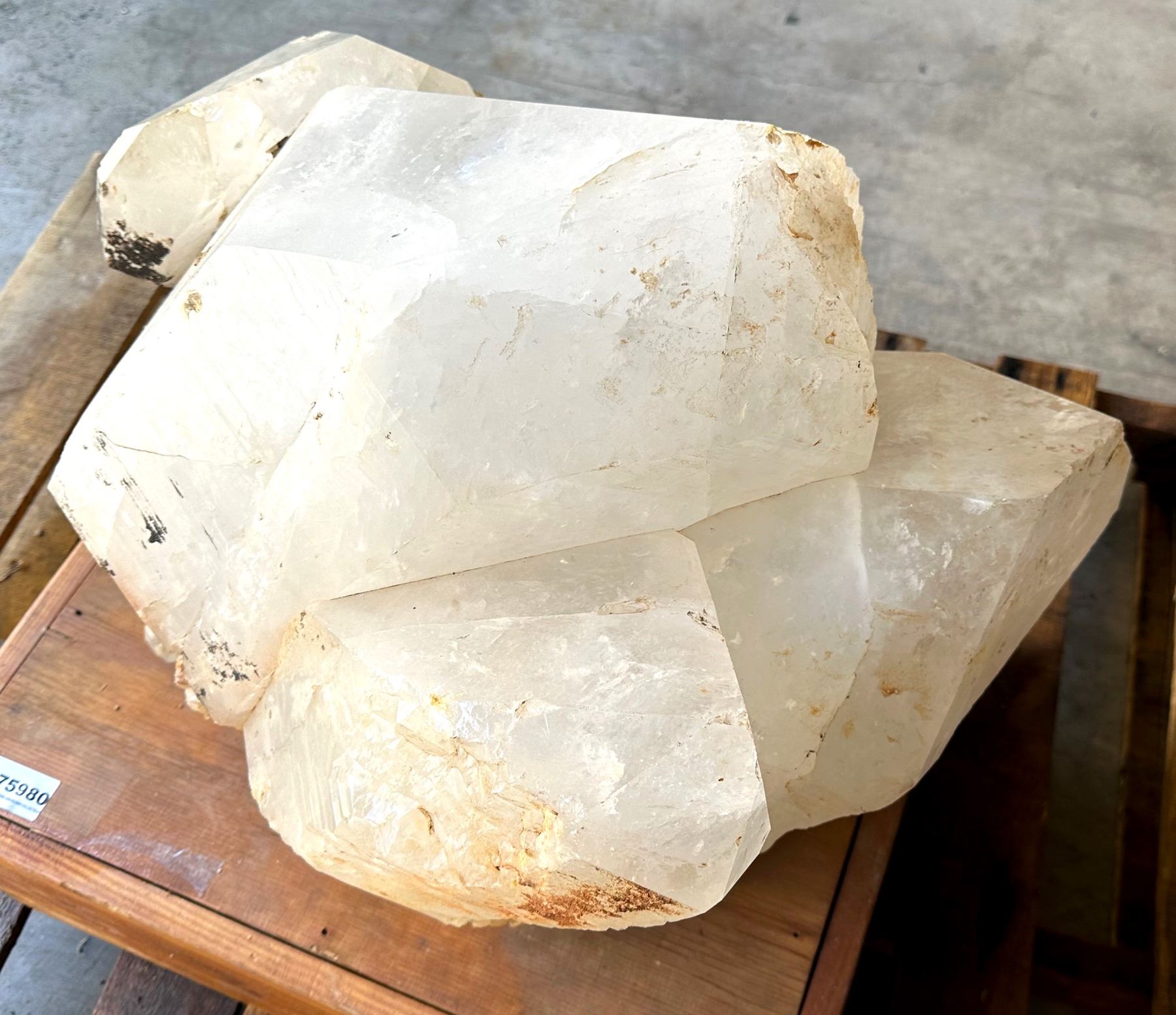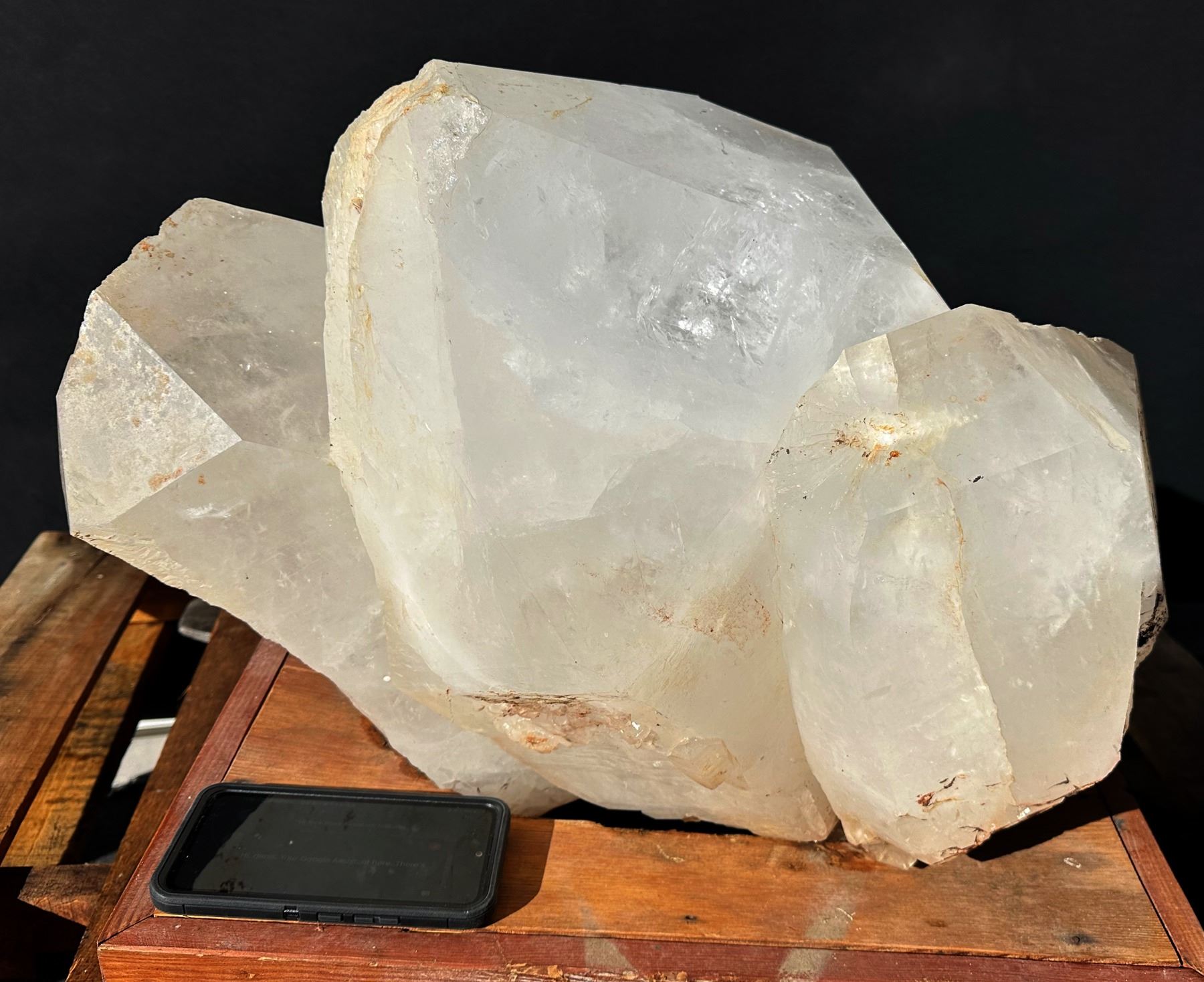 Large Quartz crystal Cluster of Four. one large crystal at center surrounded by three smaller crystals. Large crystal is approximately 12 x 14 x 20". Much twinning on surfaces and adjacent areas. Some edges slightly rough, with the overall appearance very "showy." Portions of the large crystal are absolutely clear. This is a very heavy and dense specimen perhaps weighing 200-plus pounds. It was one of the premier specimens collected from the Placerville, California discovery more than a decade ago.