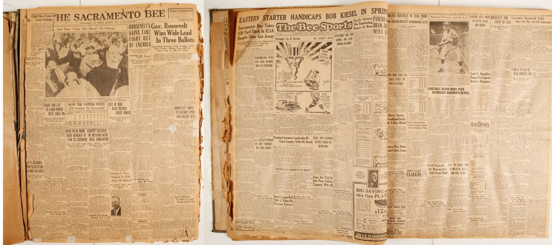 Large Book of Sacramento Bee Articles from July 1, 1932, to July 30, 1932. Has articles ranging from "Governor Roosevelt Wins Wide Lead in Three Ballots", many crime articles, advertisements of the day, & much more. Has frayed edges on several pages, many are not frayed. Separating at spine. Please inspect. 17" x 22.5".