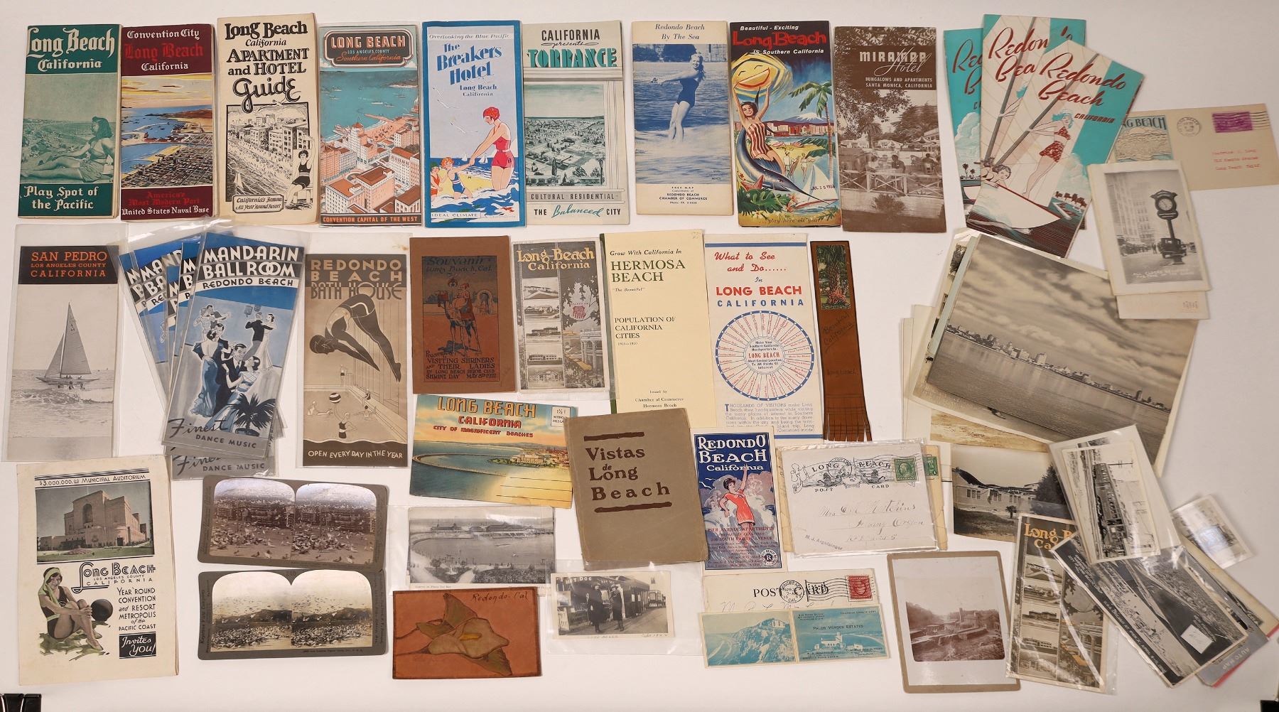 Lot of 60+. Brochures, photographs, and more. Much of the material appears to be c.1910s-40s. 1)Brochures/Pamphlets include: Hermosa Beach; Breakers Hotel Long Beach; Torrance; multiple for Redondo Beach; Miramar Hotel Santa Monica; several for the Mandarin Ball Room Redondo Beach; San Pedro; and several for Long Beach. Also: two Los Angeles pigeon stereoviews; three San Pedro Refinery photographs; Hotel Virginia pictorial lettersheets; postcards and mailers; and more. Please inspect.