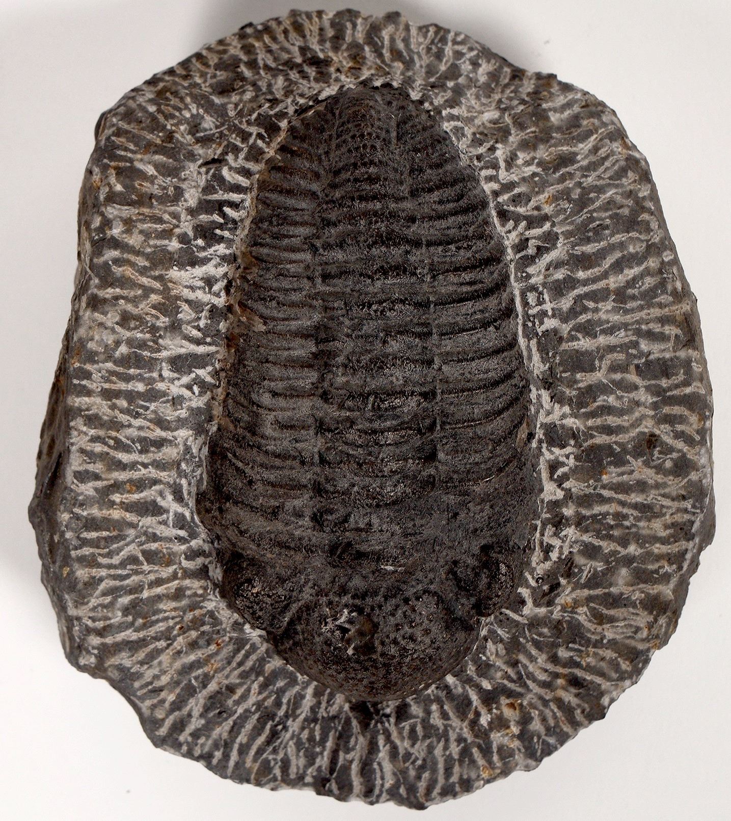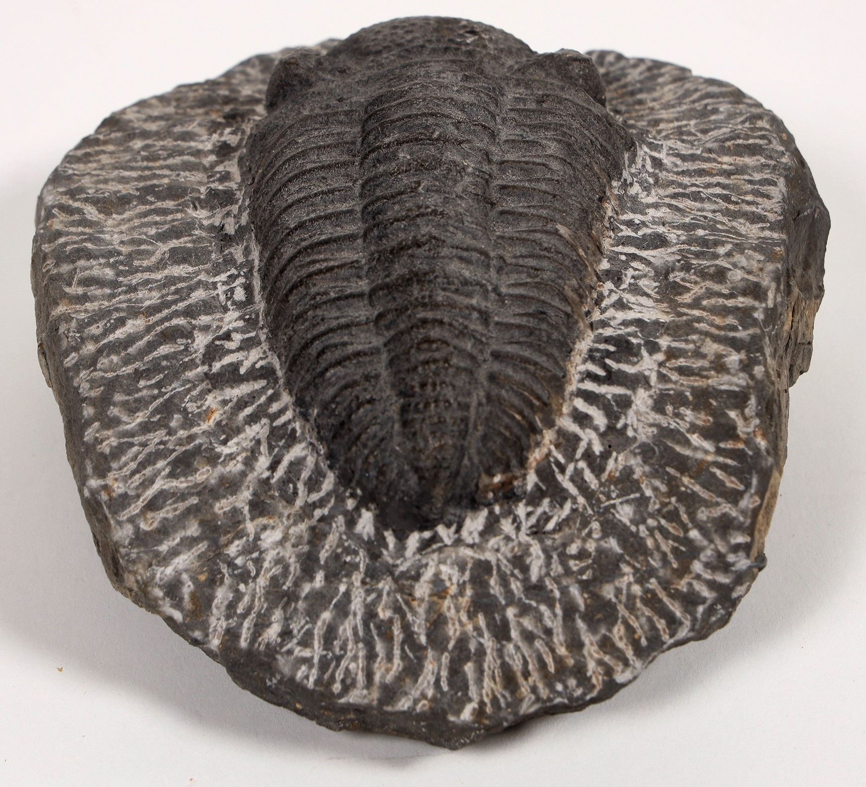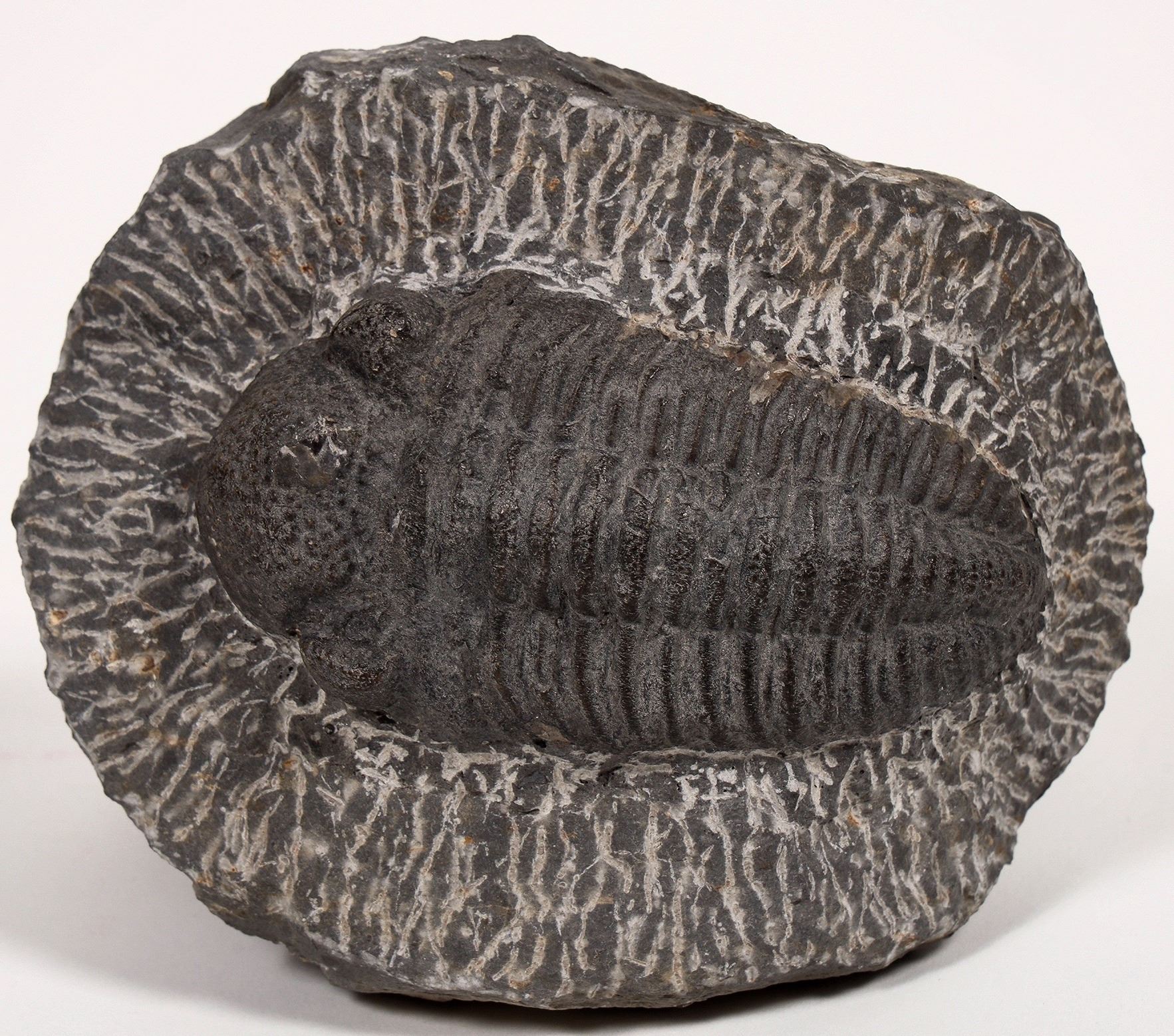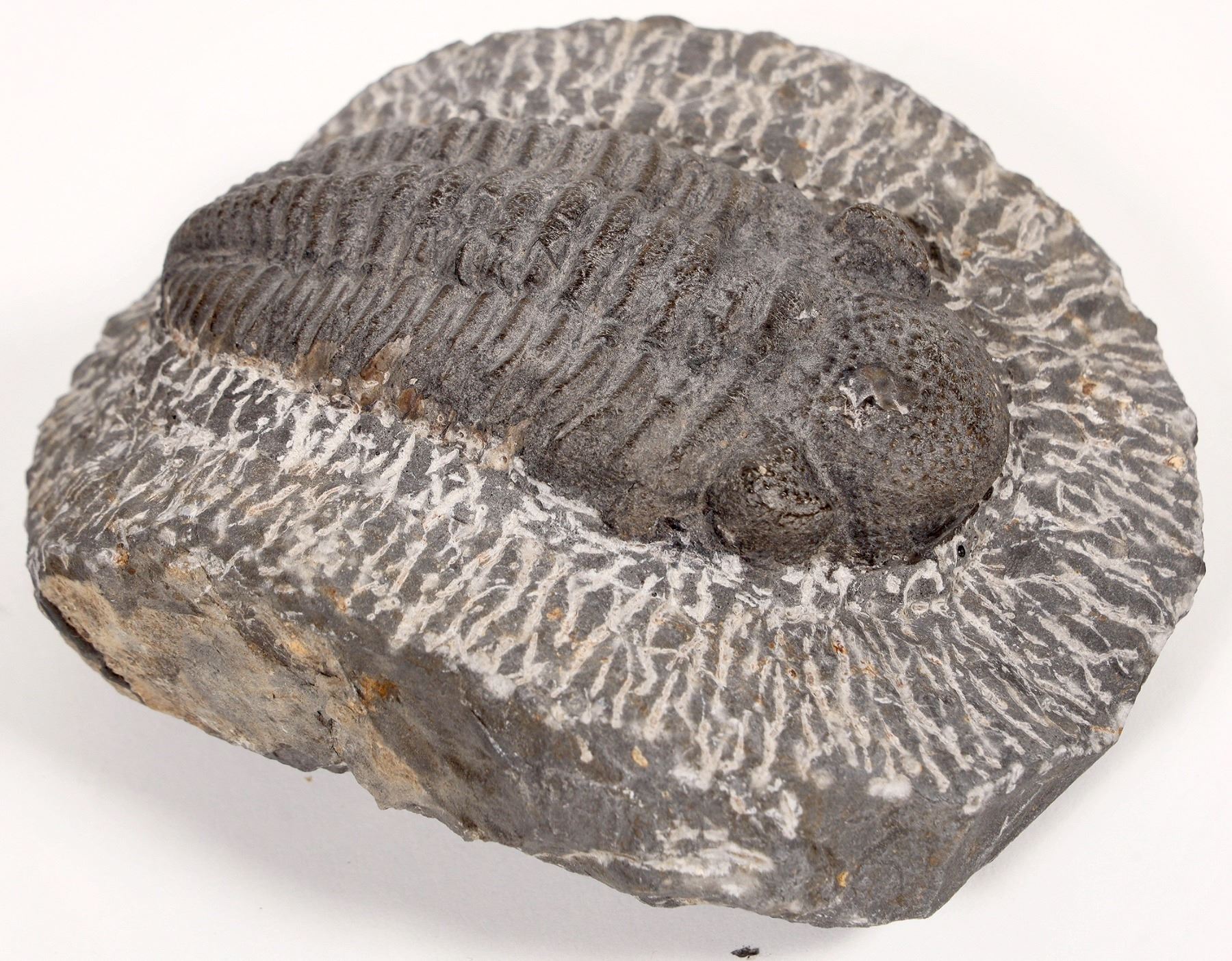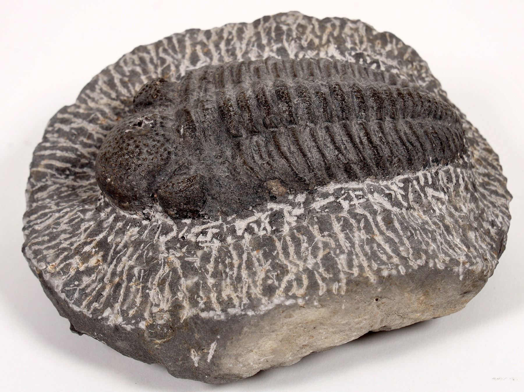 A fossil specimen of a large trilobite (the animal itself is about 4.5 inches long), originating from China. The exact species and location of discovery is unknown. The fossil has retained excellent detail and texture. Originally from the Chunlin Zhu collection.