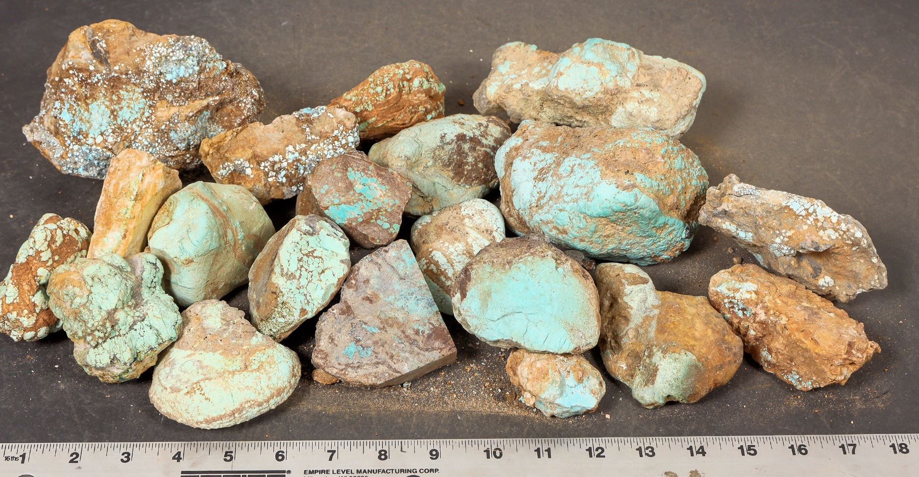 Rough turquoise - large, oxidized nuggets, green-blue color. Untreated. Approximate weight 12.2 pounds. Pieces range from around 2.25" to 5.5" in length, largest piece in lot measures approx. 5.5" x 4.5" x 3.5" at widest points. These are unique specimens that could make some beautiful display pieces; see photos. This turquoise originates from the No. 8 turquoise mine of Cortez, Nevada, often considered one of the top turquoise mines in the world. It was previously in storage for 35 years.