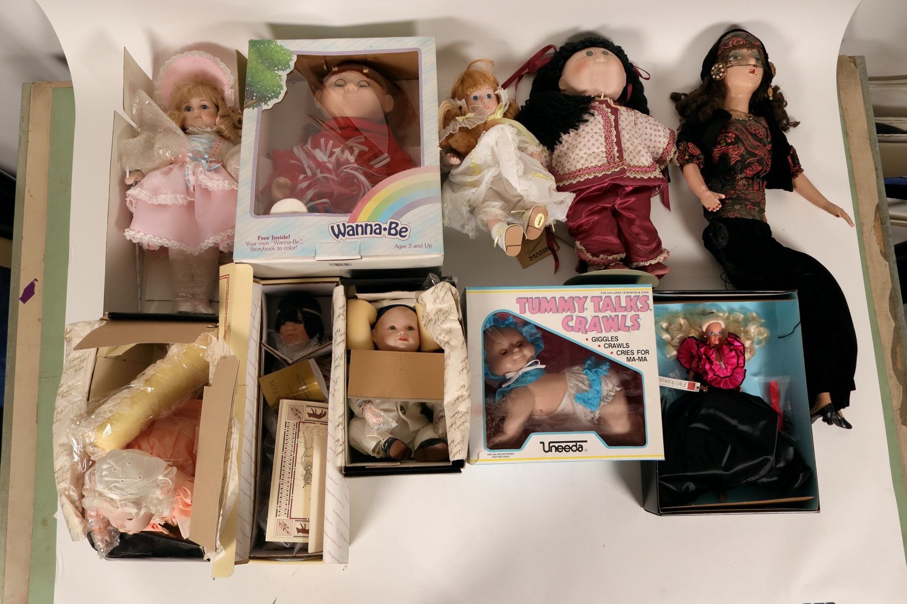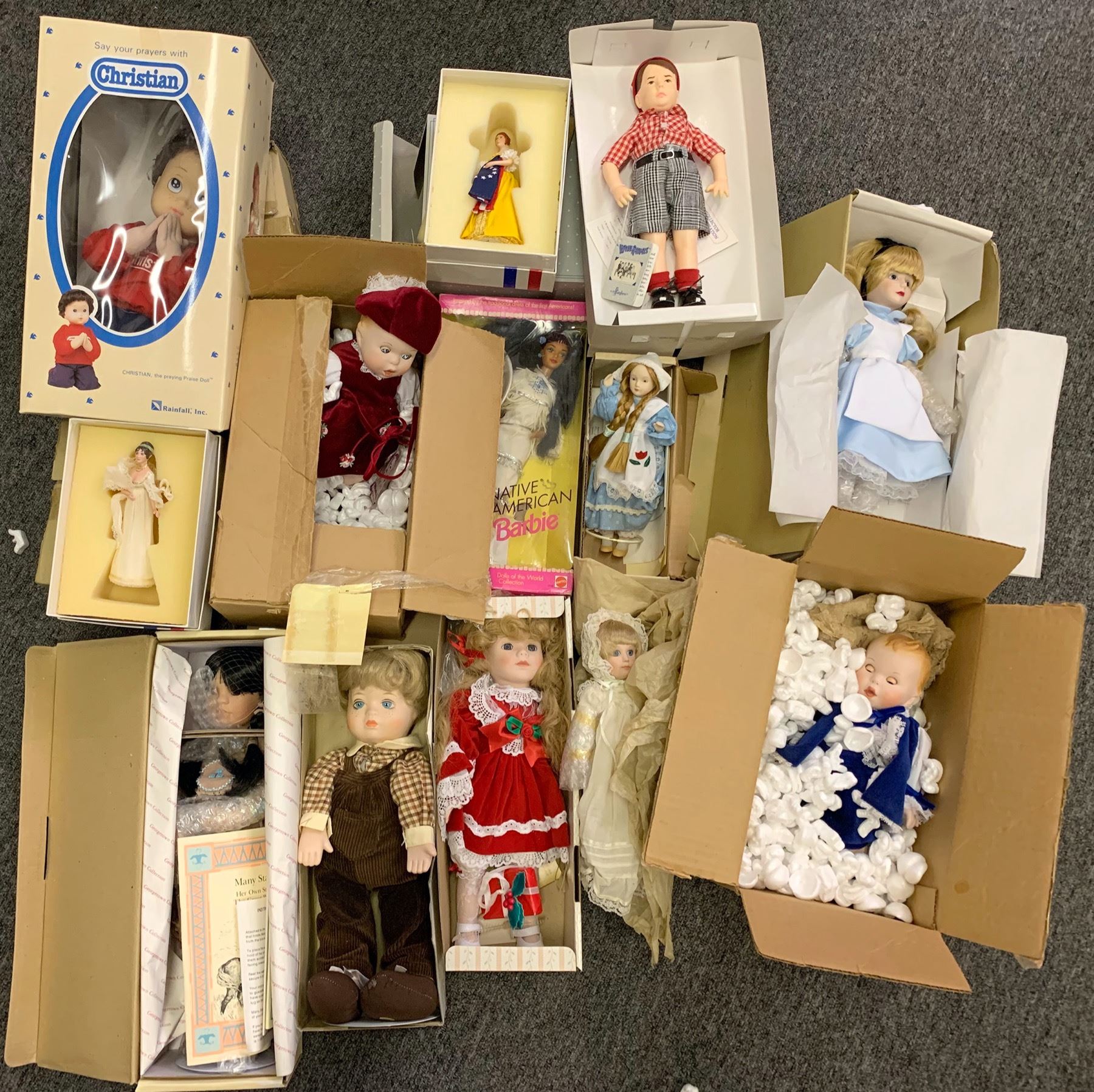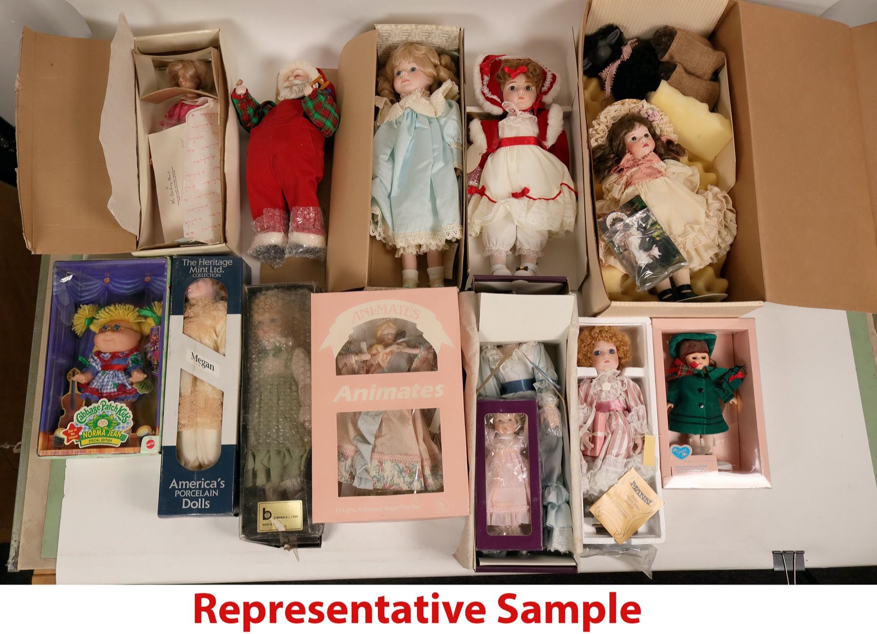 This is a lot of collectible and porcelain dolls: Tracey of the Heirloom Treasures collection by Mann; (2) Shannon Michele porcelain dolls; Ba Ba Black Sheep by Wendy Lawton; a tree top doll that lights up by Animates; a Santa's workshop musical doll NIB; Ginny Victorian Christmas doll; Norma Jean Cabbage Patch doll NIB; (3) Princess Diana Royal Wardrobe Collection dolls; (1) Brinn's doll with light green dress; (1) heritage Mint Meagan doll; (1) Precious Motherhood doll; Yolanda's Picture Perfect Babies by Knowles; (1) Say your prayers Christian doll; Uneeda Tummy Talks and Crawls doll; Quick Fox doll by Linda Mason Georgetown Collection; Many Stars doll by Linda Mason; (2) Seymour Mann Connoisseur Collection doll; Barbie Night Sensation doll for FAO Schwarz by Mattel; Wannabee "W" Badger fan doll; a Cabbage Patch Kid doll named Karen Tilly; A Gerber Boy and a Gerber Girl; Native American Barbie doll by Mattel; a small baby doll with off white dress; Little Dutch Girl; Effanbee Little Rascals "Spanky" doll; (2) Half dolls by U.S. Historical Society Betsy Ross, Dolly Madison; one boy by Marm; Alice in Wonderland for the Disney Collection; several doll stands.