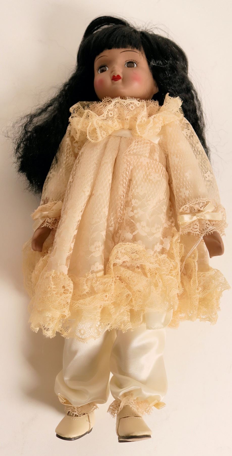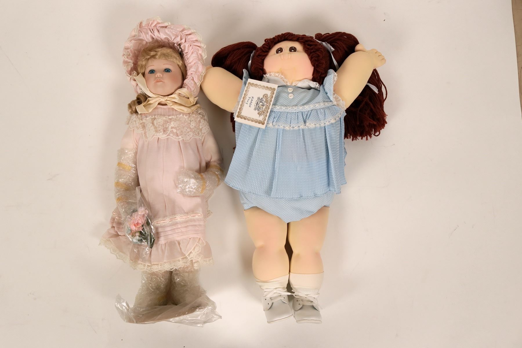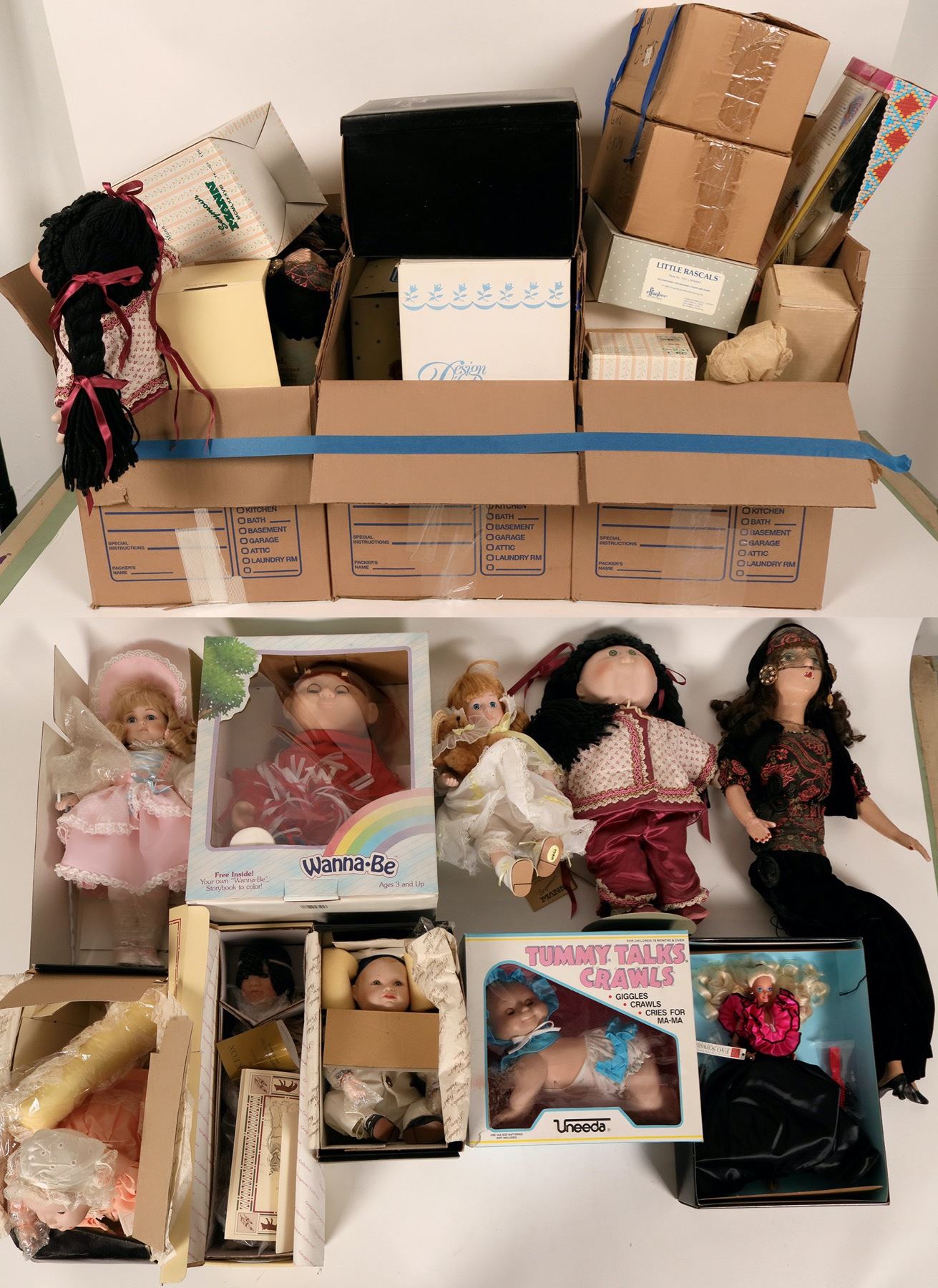 This is a lot of collectible and porcelain dolls: Tracey of the Heirloom Treasures collection by Mann; (2) Shannon Michele porcelain dolls; Ba Ba Black Sheep by Wendy Lawton; a tree top doll that lights up by Animates; a Santa's workshop musical doll NIB; Ginny Victorian Christmas doll; Norma Jean Cabbage Patch doll NIB; (3) Princess Diana Royal Wardrobe Collection dolls; (1) Brinn's doll with light green dress; (1) heritage Mint Meagan doll; (1) Precious Motherhood doll; Yolanda's Picture Perfect Babies by Knowles; (1) Say your prayers Christian doll; Uneeda Tummy Talks and Crawls doll; Quick Fox doll by Linda Mason Georgetown Collection; Many Stars doll by Linda Mason; (2) Seymour Mann Connoisseur Collection doll; Barbie Night Sensation doll for FAO Schwarz by Mattel; Wannabee "W" Badger fan doll; a Cabbage Patch Kid doll named Karen Tilly; A Gerber Boy and a Gerber Girl; Native American Barbie doll by Mattel; a small baby doll with off white dress; Little Dutch Girl; Effanbee Little Rascals "Spanky" doll; (2) Half dolls by U.S. Historical Society Betsy Ross, Dolly Madison; one boy by Marm; Alice in Wonderland for the Disney Collection; several doll stands.