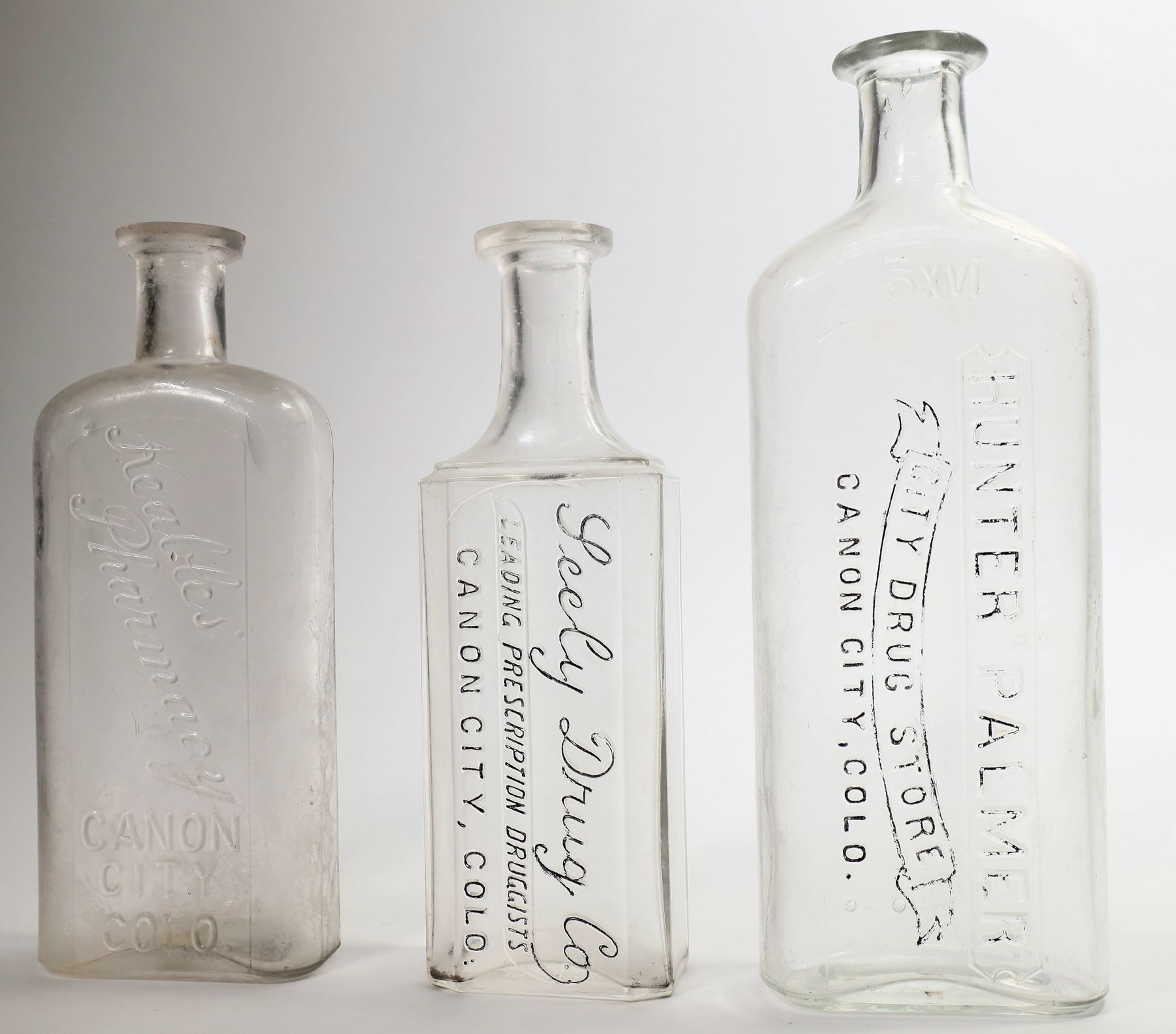 2. KEABLES' PHARMACY/CANON CITY, COLO. 7 3/8". One tiny flea bite nick on the rim. Otherwise the bottle is damage free. Overall light exterior stain.