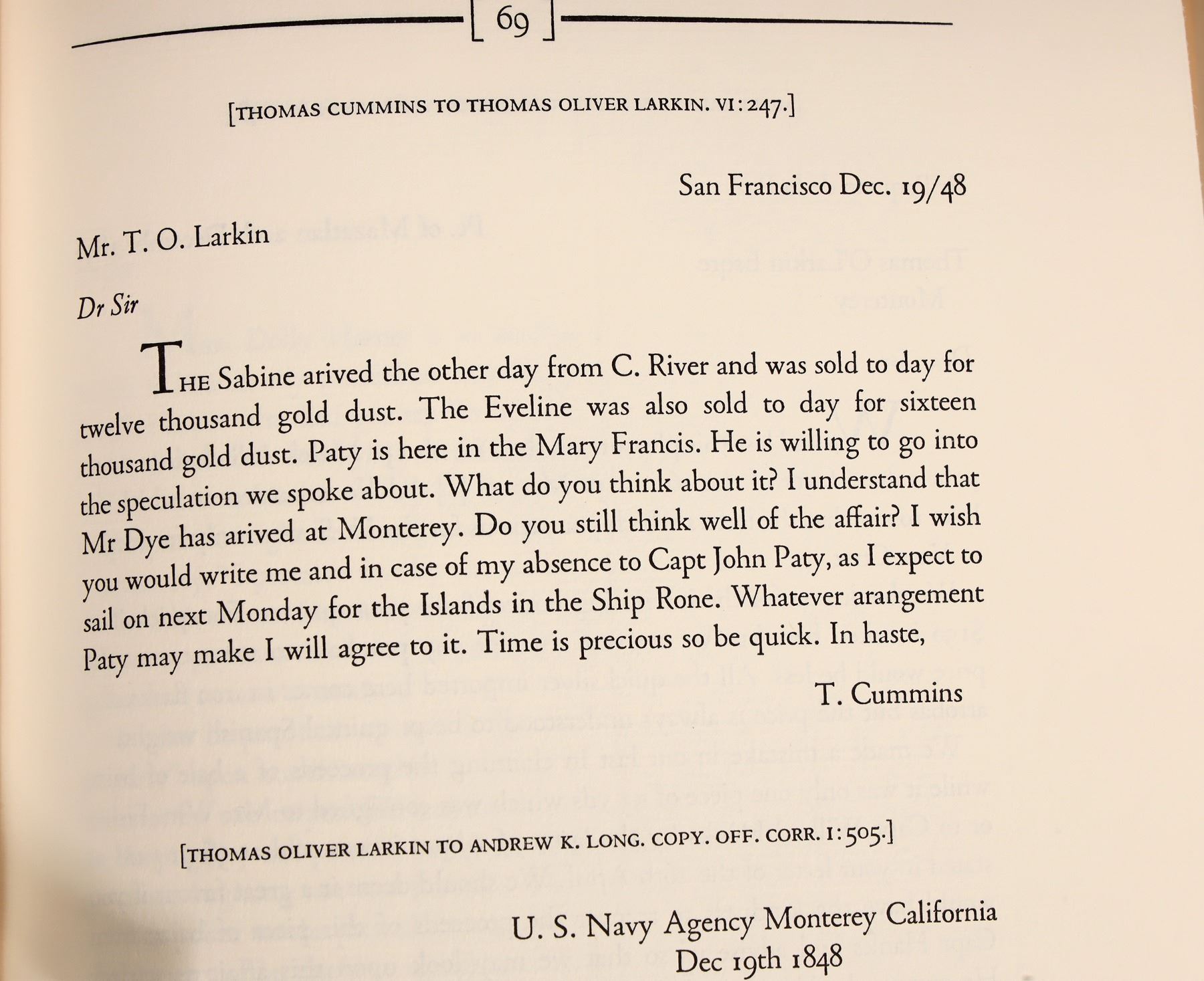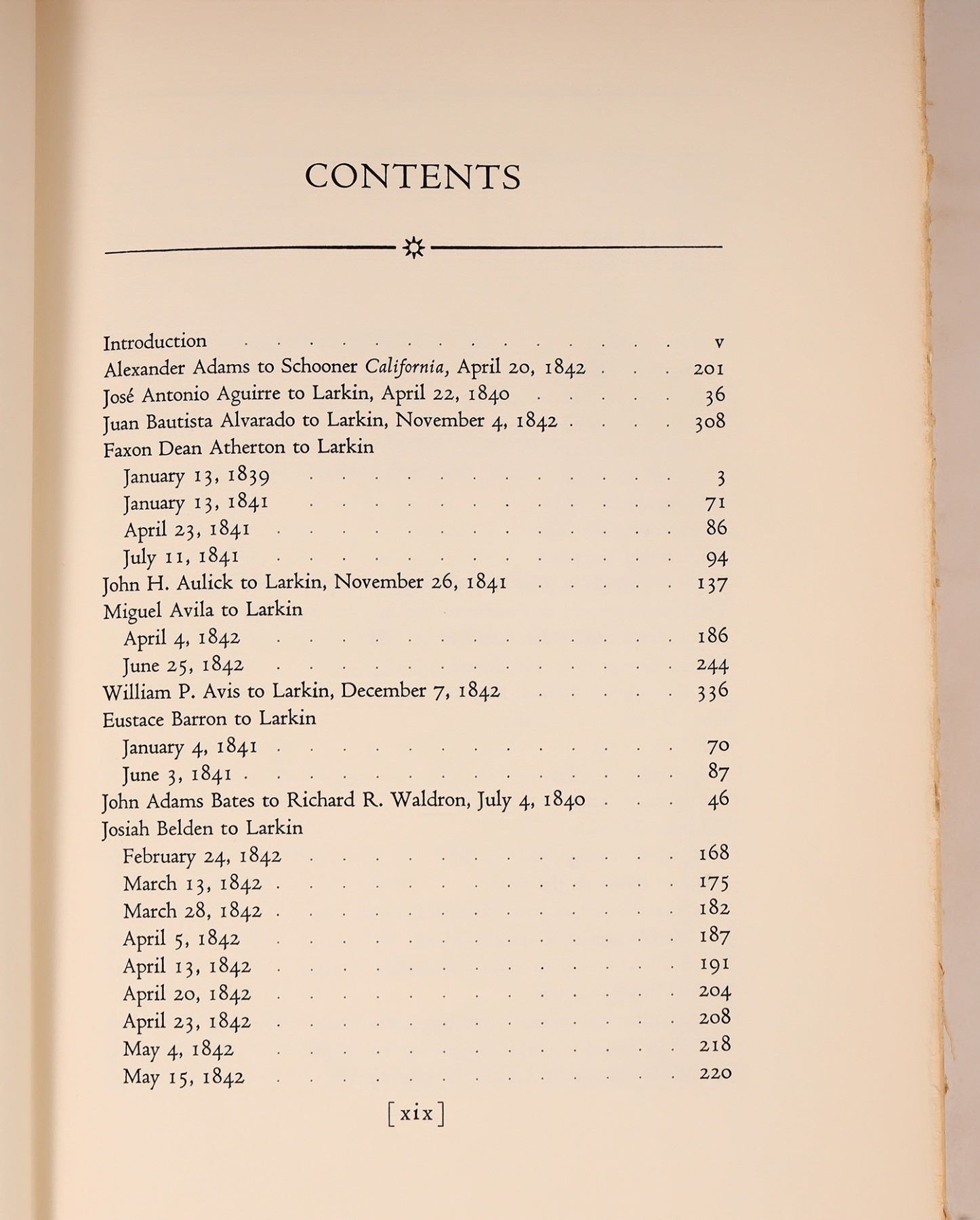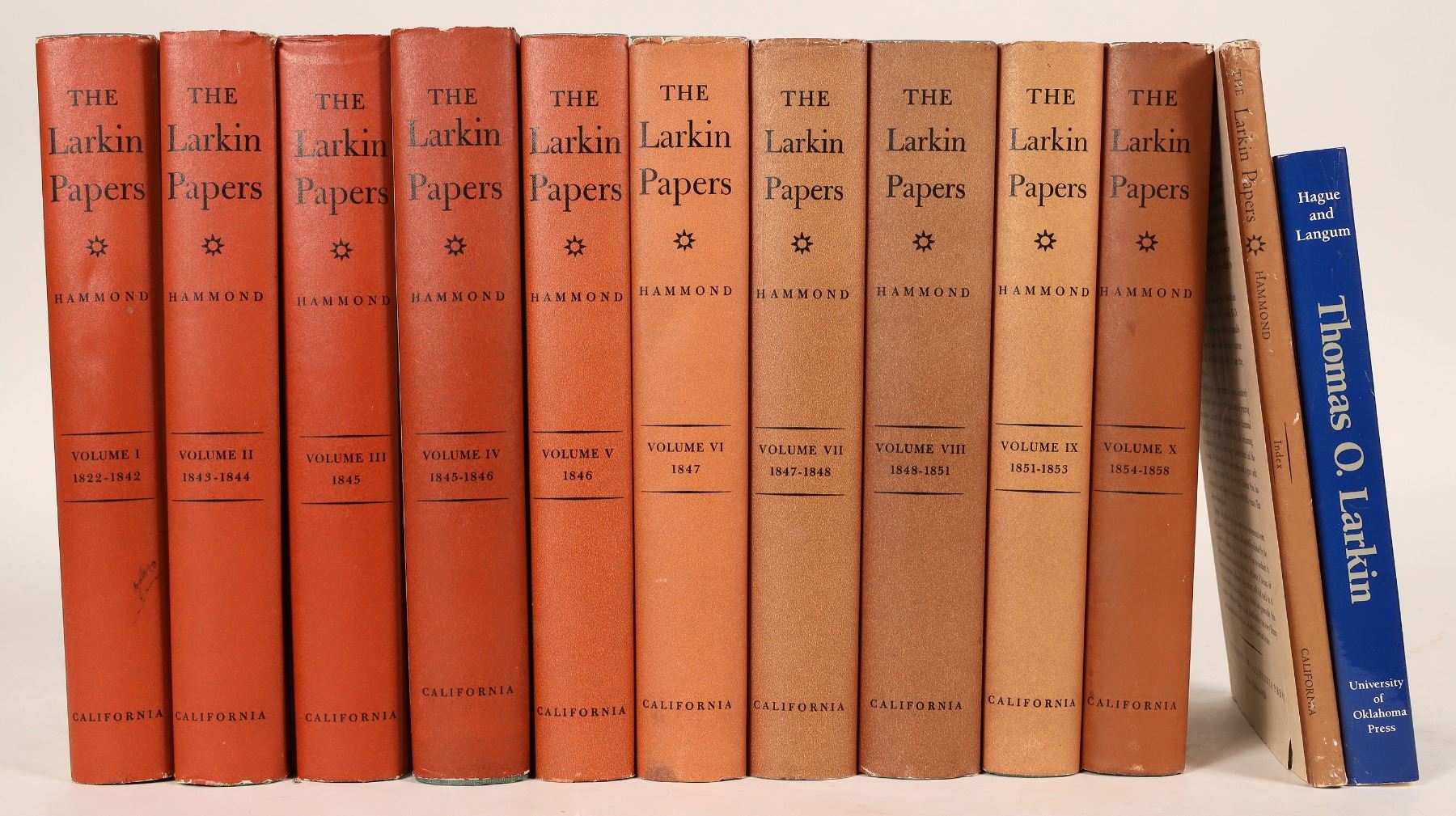 All 10 1955 volumes of The Larkin Papers, for the History of California by George P Hammond plus index volume, all with dustjackets. Personal, business and official correspondences of Thomas Oliver Larkin, merchant and US Counsel in California. He was under secret orders from Secretary of State James Buchanan to promote the peaceful annexation of California by every means at his disposal. 1st edition, run of 1000. 25 lbs.