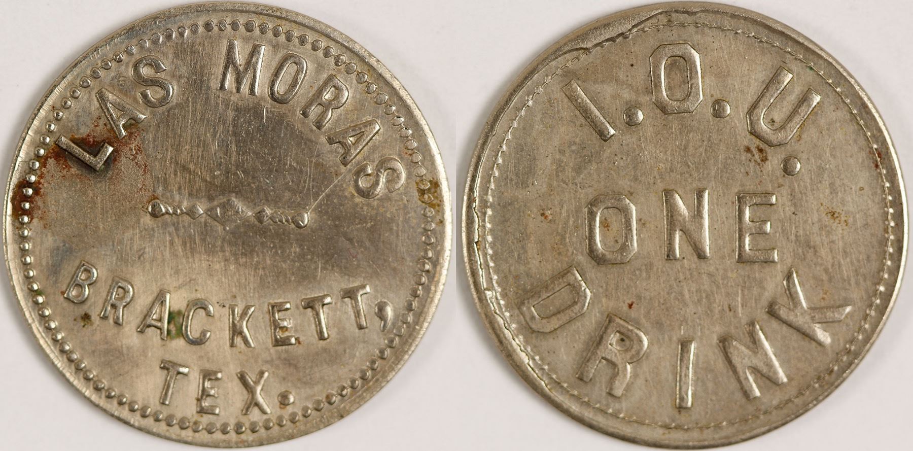 Round white metal 25mm LAS MORAS / BRACKETT, TEX. // I. O .U. / ONE / DRINK HWAC# 62318 Date: Location: Brackett, Texas