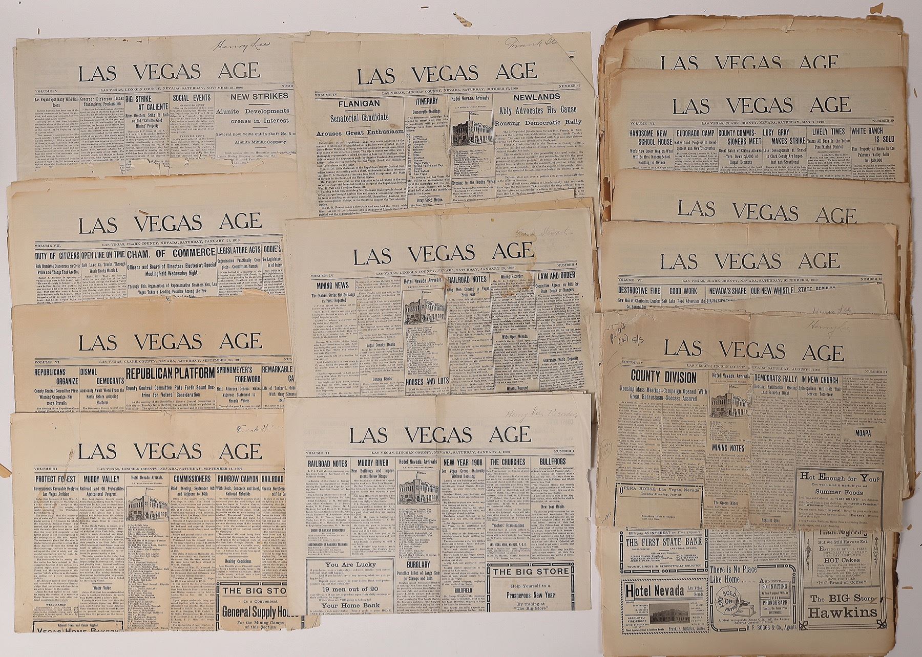 18 issues total-1907(1), 1908(6), 1910 (11). Stories of Governor Oddie, politics, big strike at Caliente, fires and more. Folds, chips and some tears.